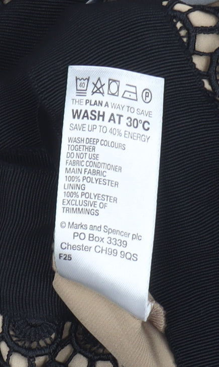 Elevate your formal wardrobe with this elegant Marks and Spencer Women's Black Lace Pencil Skirt in size 16. Perfectly combining sophistication with a touch of allure, this skirt features a striking geometric lace pattern that effortlessly catches the eye. The intricate detailing and classic black colour make it a versatile addition to any season's collection, particularly suitable for autumn and winter events. The straight and pencil style offers a sleek silhouette that enhances your natural curves, making it an ideal choice for professional settings or formal occasions. This skirt boasts a regular size fit with a comfortable mid-rise waist. Its 100% polyester fabric ensures durability and easy maintenance, as it is machine washable. The zip closure provides a secure fit while maintaining a smooth look. Pair this luxurious skirt with a blouse and heels for an impeccable business or evening ensemble. With its condition being brand new and original tags still attached, you can be confident in the quality and pristine condition of this gorgeous piece. Don’t miss the opportunity to add a timeless staple to your collection, as this skirt promises to be a go-to choice for creating effortless, elegant looks.