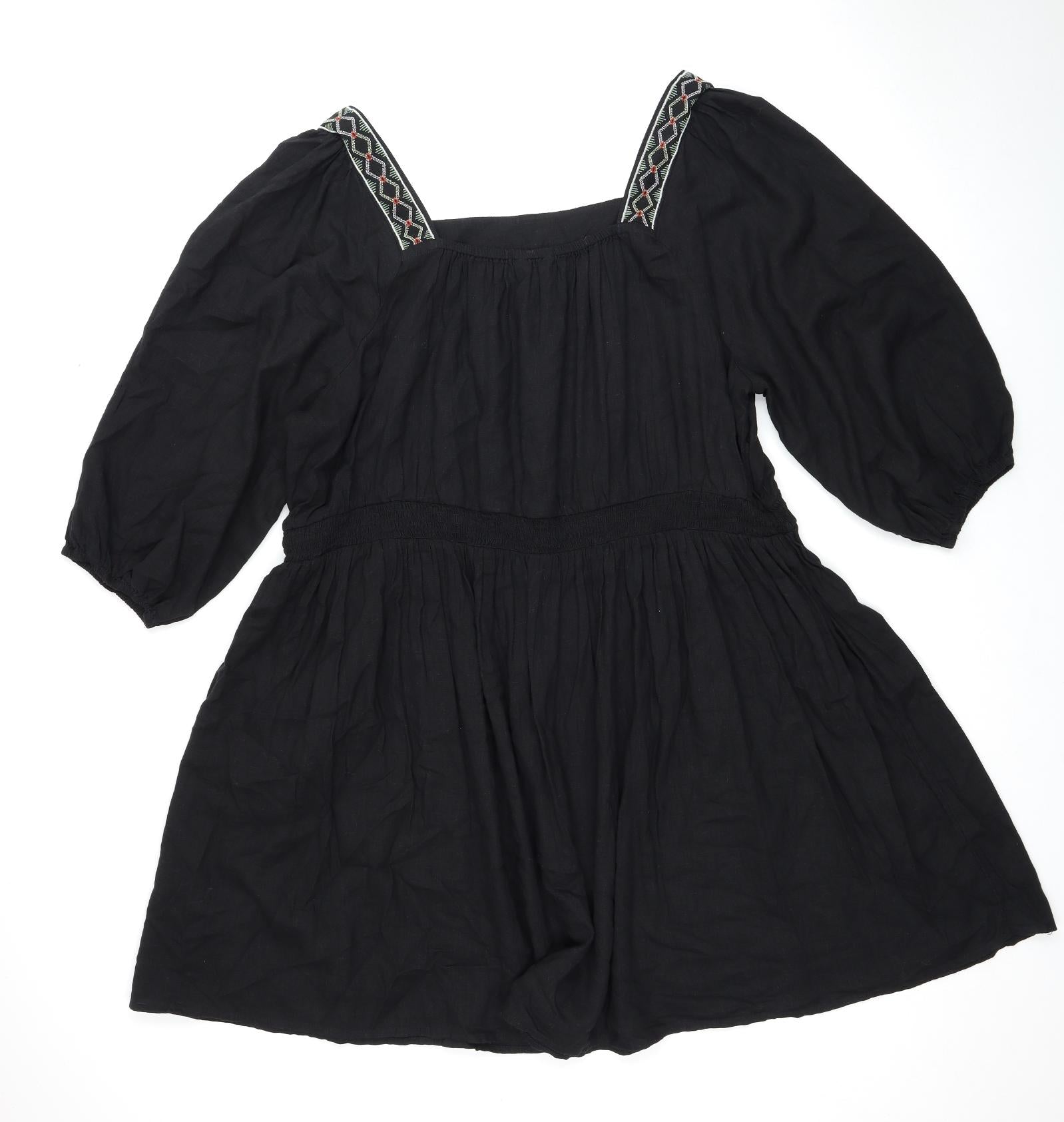 Womens Black Linen Trapeze & Swing Size 24 Square Neck Pullover - Shirred Top
