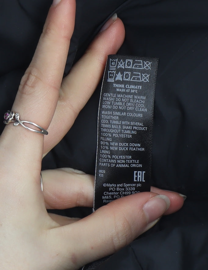 Stay cosy and stylish through the colder months with this Marks and Spencer womens puffer coat. Designed in a classic black colour, it offers a sleek and modern silhouette while providing exceptional warmth. Crafted from 100% polyester with a 90% new duck down and 10% new duck feather filling, the coat delivers outstanding insulation without feeling heavy. The long length offers additional coverage, making it an ideal choice for winter days and cold evening outings. This coat features a hood for added protection against wind and rain, a practical full zip fastening, and quilting details that not only enhance its padded design but also add a contemporary touch. Its regular fit ensures comfort and allows for layering underneath without bulk. The outer shell is made of durable polyester, while the soft polyester lining ensures a smooth feel against the skin. Perfect for everyday wear, travel, or casual occasions, this coat keeps you warm while maintaining a refined appearance. Though it has very minor surface marks on close inspection, the overall condition remains very good, reflecting gentle previous use and careful care. This hooded puffer coat by Marks and Spencer Collection combines functionality, quality craftsmanship, and timeless appeal, making it a reliable wardrobe essential for women who value warmth and style in equal measure. A must-have winter staple, ideal for pairing with jeans and boots for comfort and effortless sophistication.
