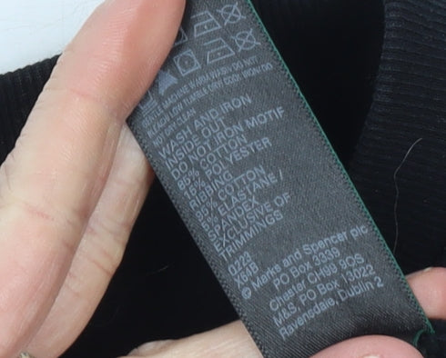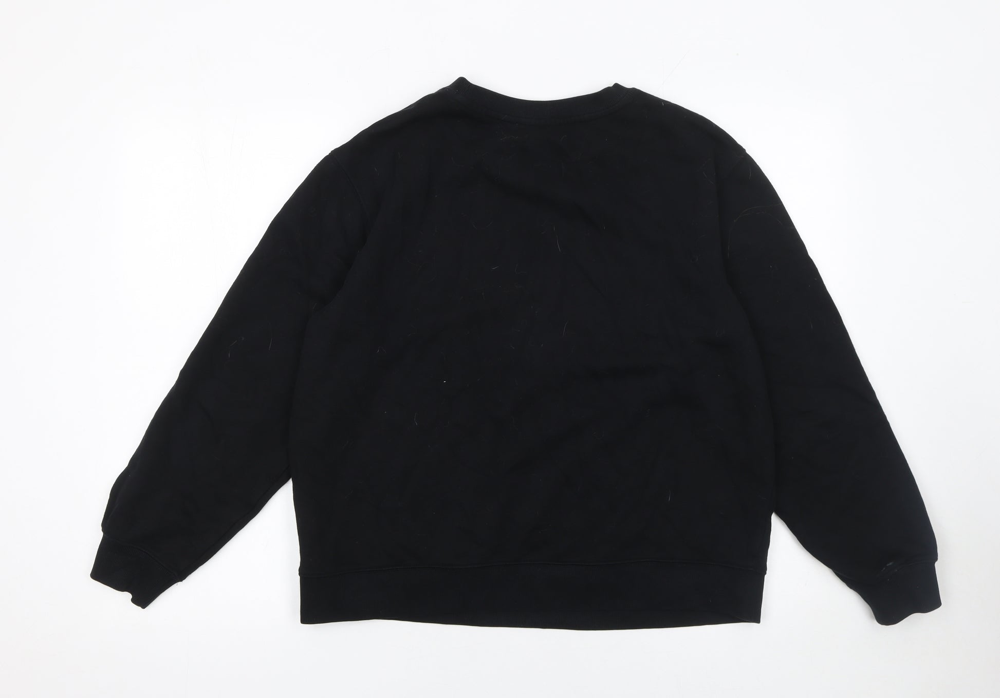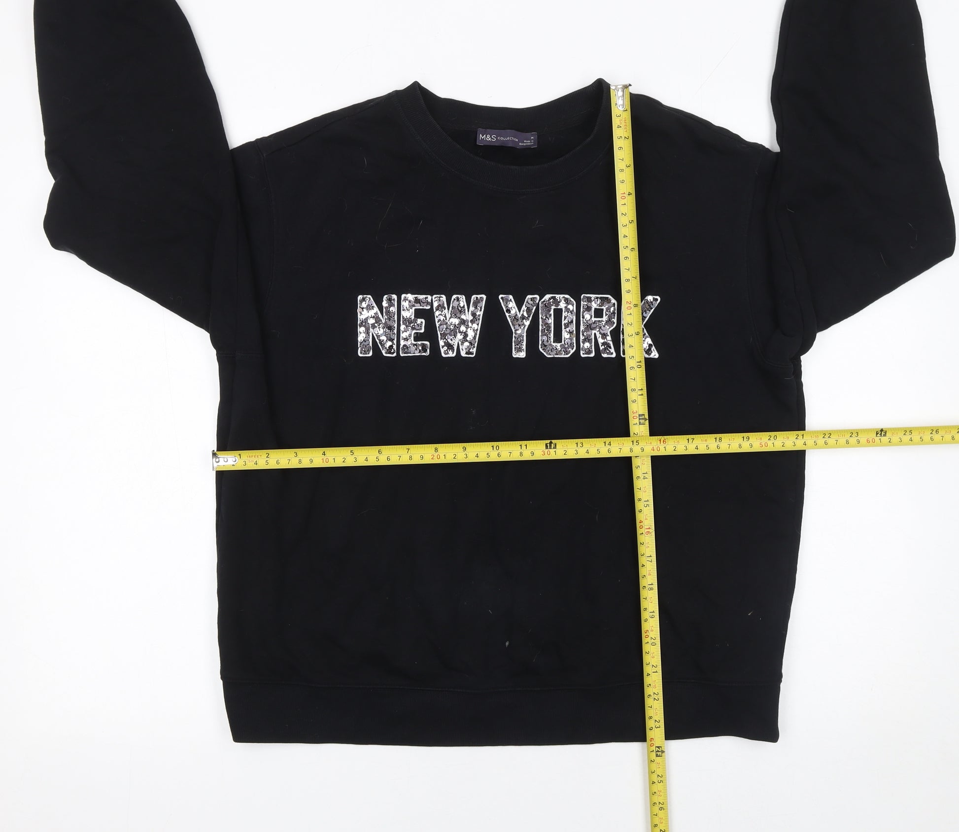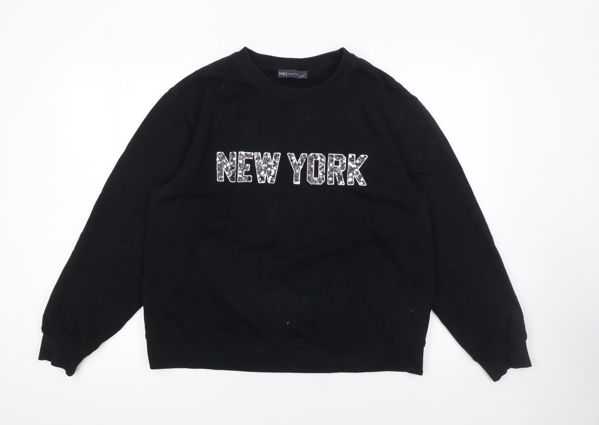 Add a touch of urban charm to your off-duty wardrobe with this stylish Marks and Spencer women's sweatshirt. Designed in a versatile black shade, this classic crew neck pullover features a bold 'NEW YORK' sequin motif across the chest, adding a contemporary sparkle to a relaxed silhouette. Crafted from a comfortable cotton and polyester jersey blend, it provides softness, durability, and easy everyday wearability. The ribbed trims at the cuffs and hem help retain shape while offering a snug fit. Lightweight and easy to pair with jeans or joggers, it’s perfect for layering throughout spring, autumn, and winter.The sweatshirt offers a regular fit, giving you a casual yet put-together look. Its sequin and logo accents make it ideal for those who love city-inspired fashion and want something both eye-catching and comfortable. Whether you’re running errands, relaxing at home, or heading out for a casual outing, this piece delivers effortless style with minimal effort. Its machine-washable fabric ensures low maintenance and long-lasting wear, while the inner cotton lining adds an extra layer of softness against the skin.With its timeless shape and subtle shimmer, this Marks and Spencer sweatshirt is a must-have for anyone who enjoys fashion with a hint of playful city chic. It’s ideal as a layering piece under jackets or as a statement item on its own. Despite some minor lint and a faint mark on the front, it remains in very good condition and ready to bring comfort and style to your wardrobe. A perfect choice for casual weekends or travel adventures.