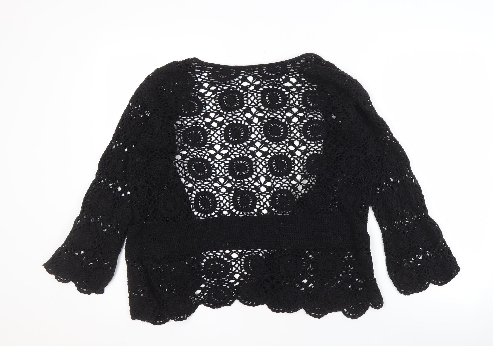 Elevate your wardrobe with this elegant Marks and Spencer open-knit cardigan in a timeless black hue. Perfect for women, this classic cardigan drapes beautifully, offering versatility whether layered for all seasons or worn alone during warmer days. Crafted with care, it features a stylish button accent, adding a touch of sophistication to your casual outfits. Made primarily from cotton blended with polyester, the crochet fabric gives an airy, breathable feel while ensuring comfort and durability. The regular fit and size 20 adjust easily to body contours, making it an excellent choice for everyday wear or special occasions. Its open front design makes it easy to style over a simple tee or dress, ensuring you stay fashionable and comfortable. Enhance your collection with this piece, ideal for adding texture and elegance to any look. A reliable choice for casual meetups or laid-back gatherings. Please note: excellent condition with no visible signs of wear.