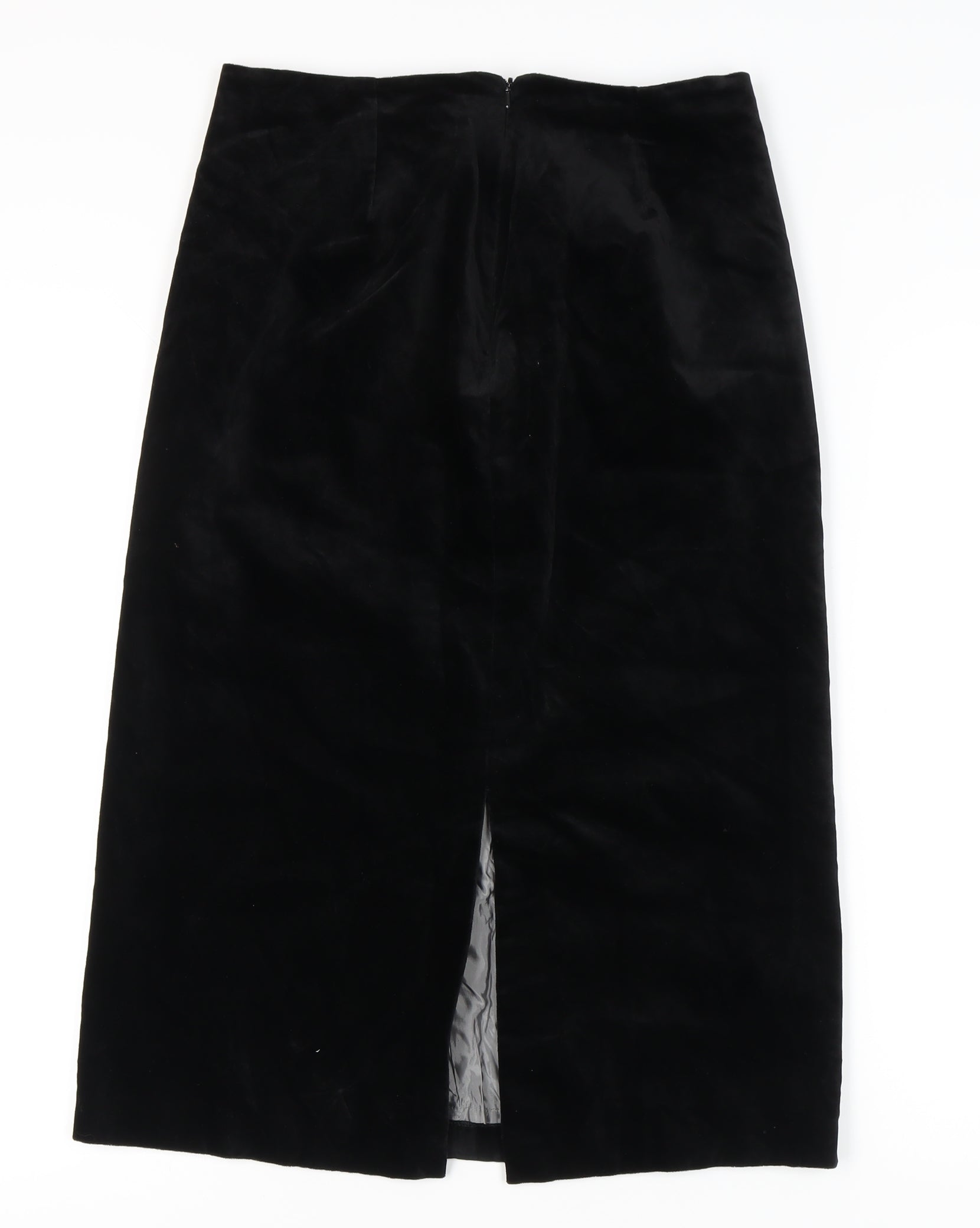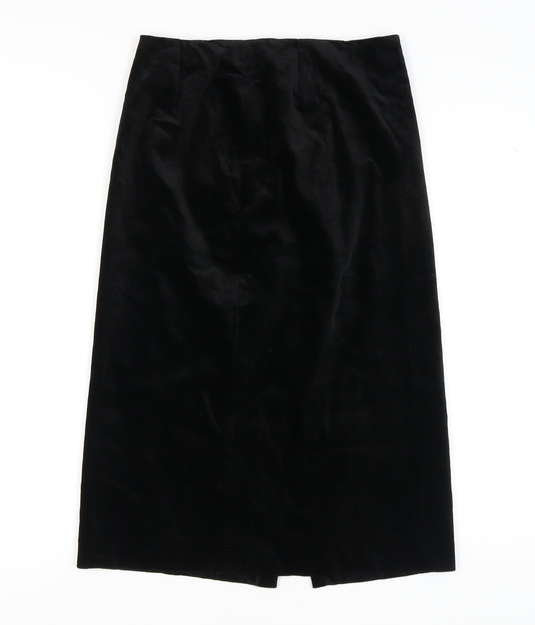 This elegant black pencil skirt from Marks and Spencer is a timeless addition to any wardrobe. Crafted to perfection, the skirt offers a sleek and sophisticated silhouette that's perfect for business, formal settings, or everyday workwear. Made with a blend of materials, including 78% cotton for comfort, 21% modal for a soft finish, and 1% elastane for a touch of stretch, this skirt combines practicality with style. The knee-length design enhances its classic appeal, while the mid-rise waist and added slit ensure a flattering fit for all seasons. The discreet zip closure at the back provides ease of wear, and the lined interior ensures a smooth finish. With no visible wear or tear, this skirt is in excellent condition and ready to elevate your outfit with its refined style.
