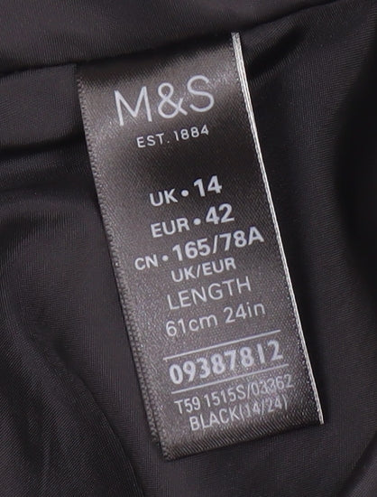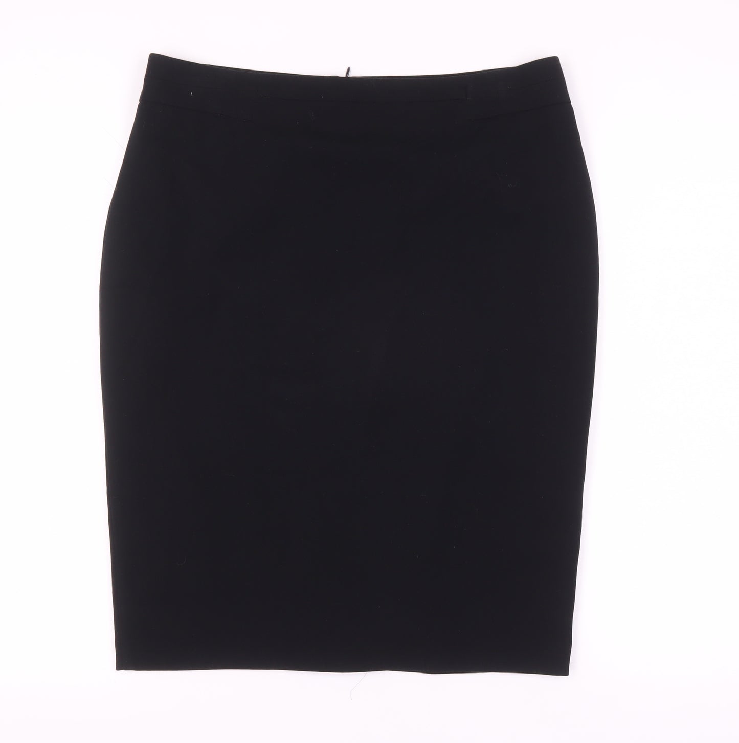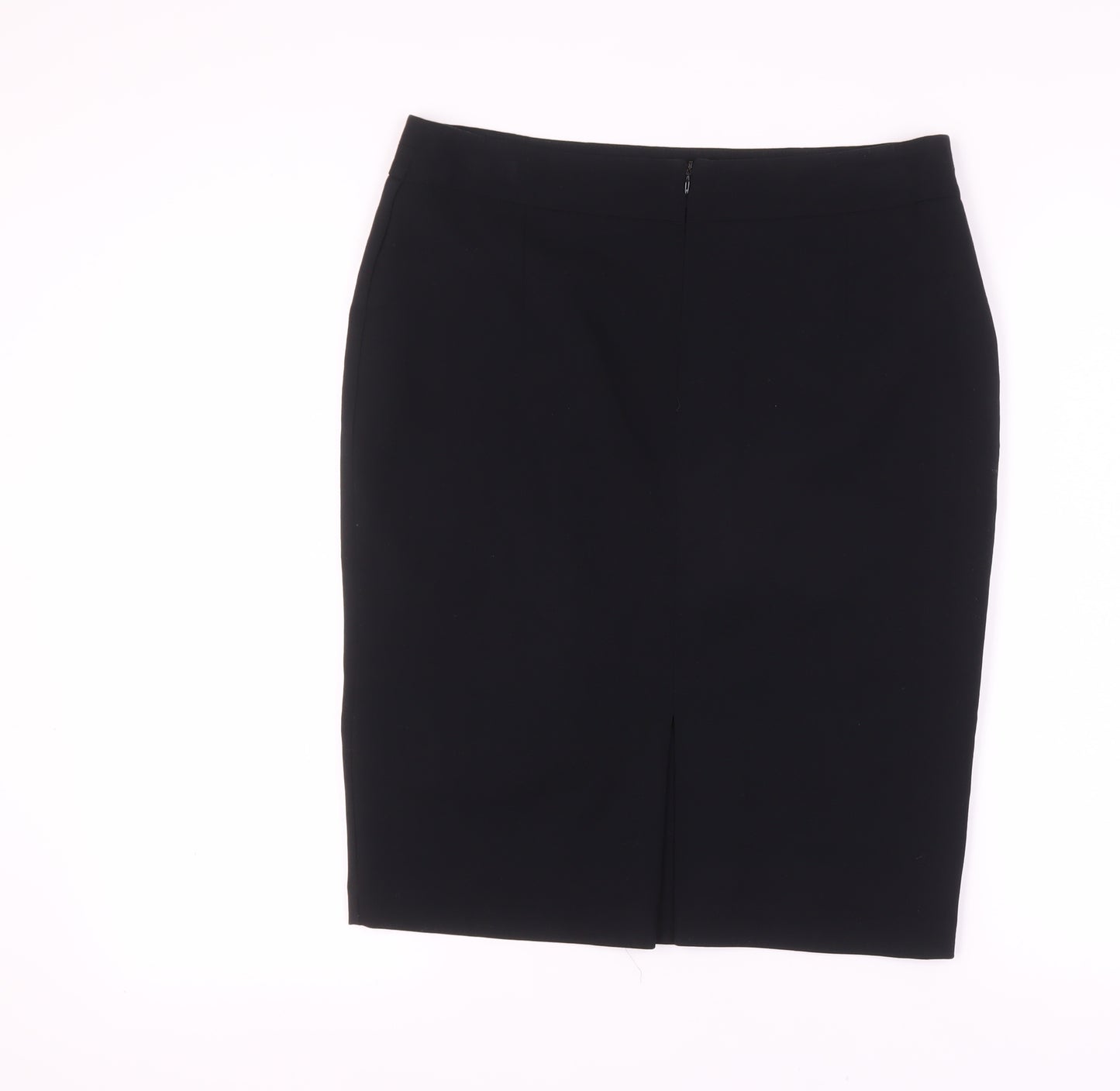 Elevate your work wardrobe with this elegant black pencil skirt from Marks and Spencer, available in size 14. Crafted for women who appreciate classic style combined with modern comfort, this skirt offers a flattering fit and showcases the brand's renowned quality. The knee-length design and sleek straight silhouette make it a versatile piece, suitable for various occasions, from important business meetings to elegant evening events. Tailored with a combination of polyester, viscose, and elastane, this skirt provides just the right amount of stretch while maintaining its structure, ensuring you stay comfortable all day long. The smooth zip closure accentuates its streamlined look, while the lined interior adds an extra layer of luxury and softness. Its mid-rise design provides a modern edge but remains universally flattering. With a classic black hue and a no-pattern finish, it's a timeless addition that pairs well with numerous tops and accessories in your collection. Caring for this piece is a breeze, as it's machine washable, perfect for the busy professional or anyone on the go. Complete with original brand tags, this skirt is in pristine condition, ready to bolster your wardrobe with effortless style. Don’t miss out on adding this essential piece to your collection, sure to become a go-to favourite each season. Secure yours now, and experience the confidence of wearing a skirt that marries functionality with timeless fashion.