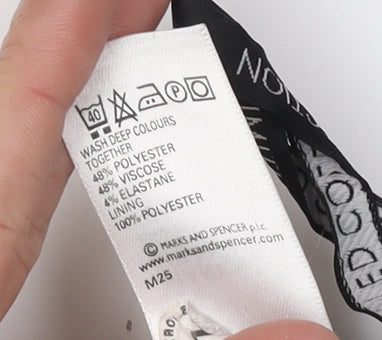 Elevate your wardrobe with this classic Marks and Spencer black pencil skirt. Designed for women who appreciate timeless elegance, this skirt is perfect for various occasions ranging from casual outings to more formal events. Crafted from a high-quality blend of polyester, viscose, and elastane, it offers a comfortable fit with a touch of stretch, ensuring ease of movement without compromising on style.The sleek, no-pattern design in versatile black makes this skirt a must-have staple for any wardrobe, seamlessly pairing with a wide range of tops and jackets. Its short length and straight pencil style make it ideal for showcasing your silhouette, while the discreet zip closure ensures a secure fit. Enjoy the convenience of machine washable fabric and the assurance of top-notch Marks and Spencer craftsmanship.The skirt's condition is excellent, showcasing its durability and quality, though no original sales tags are visible. Whether you're dressing up for a work meeting or going out with friends, this black pencil skirt provides a chic option that complements the rest of your wardrobe effortlessly. Don't miss the opportunity to add this essential piece to your collection at a fantastic price.