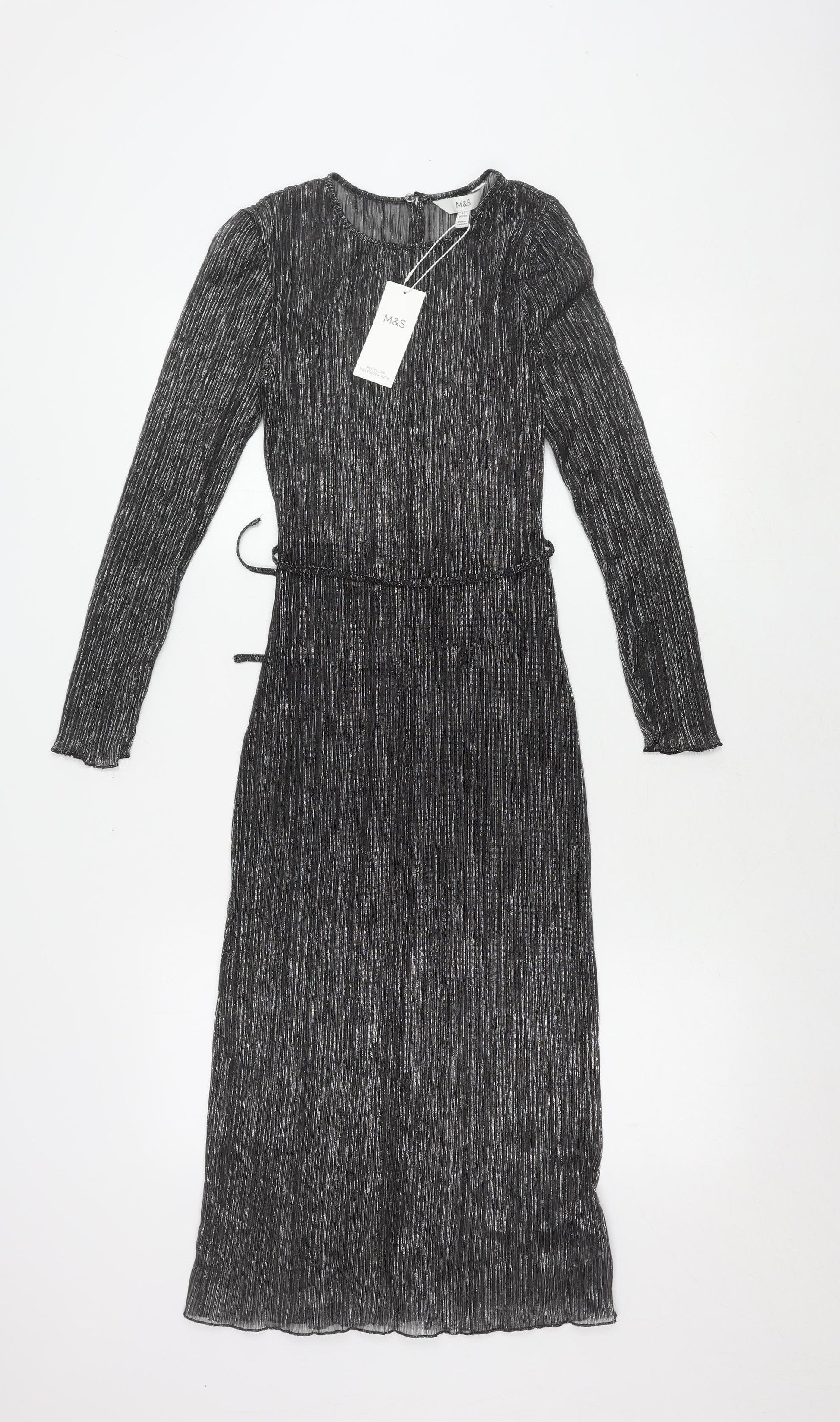 Introducing a beautiful dress from Marks and Spencer that embodies timeless elegance with a modern twist. Crafted in a rich black hue, this dress is perfect for a wide range of occasions. Its long sleeves add a touch of sophistication, ensuring you stay stylish and comfortable in different settings. Made predominantly from polyester blended with metallic threads, the fabric offers a soft yet durable construction that catches the light beautifully.This dress is tailored to flatter petites, making it a standout choice for shorter frames. With its woven texture, it brings a subtle design flair that complements the sleek black colour. Perfectly versatile, it pairs seamlessly with a variety of accessories, allowing you to dress it up or keep it casual according to your mood or occasion.The overall fit promises comfort without compromising on style. It’s machine washable, ensuring low maintenance while maintaining its refined look over time. Ideal for work or evening outings, this Marks and Spencer dress is a must-have addition to any wardrobe. Whether you're attending a formal function or enjoying a day out, this dress guarantees you’ll step out in confidence.