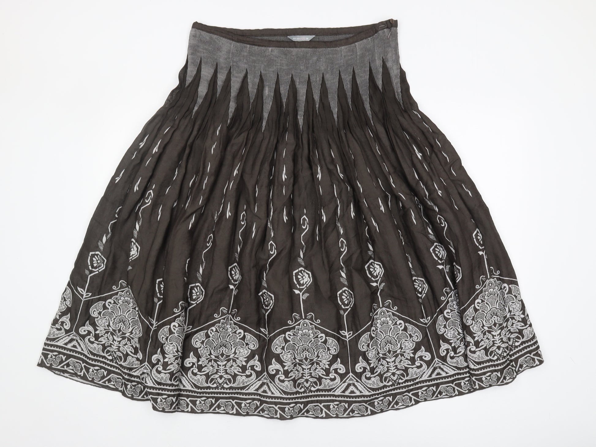 Timeless elegance meets intricate detailing in this Marks and Spencer Women's Black Pleated Skirt. With its graceful design, this skirt features stunning floral embroidery that artfully contrasts against its classic black fabric. Created for the modern woman who appreciates the blend of tradition and style, this piece is perfect for elevating any look. The regular size 14 fit offers comfort while maintaining a flattering silhouette. Whether paired with a chic blouse for formal events or a casual top for relaxed outings, this skirt caters to a variety of occasions. Crafted by the renowned Per Una range, this piece is dedicated to women who value style without compromising on quality. With its robust construction and sophisticated design, this skirt is an invaluable addition to your wardrobe essentials. Fantastic for both workwear and evening settings, its versatility allows you to effortlessly transition from day to night. Embrace its unique flair and let it become your go-to for a striking yet elegant ensemble.