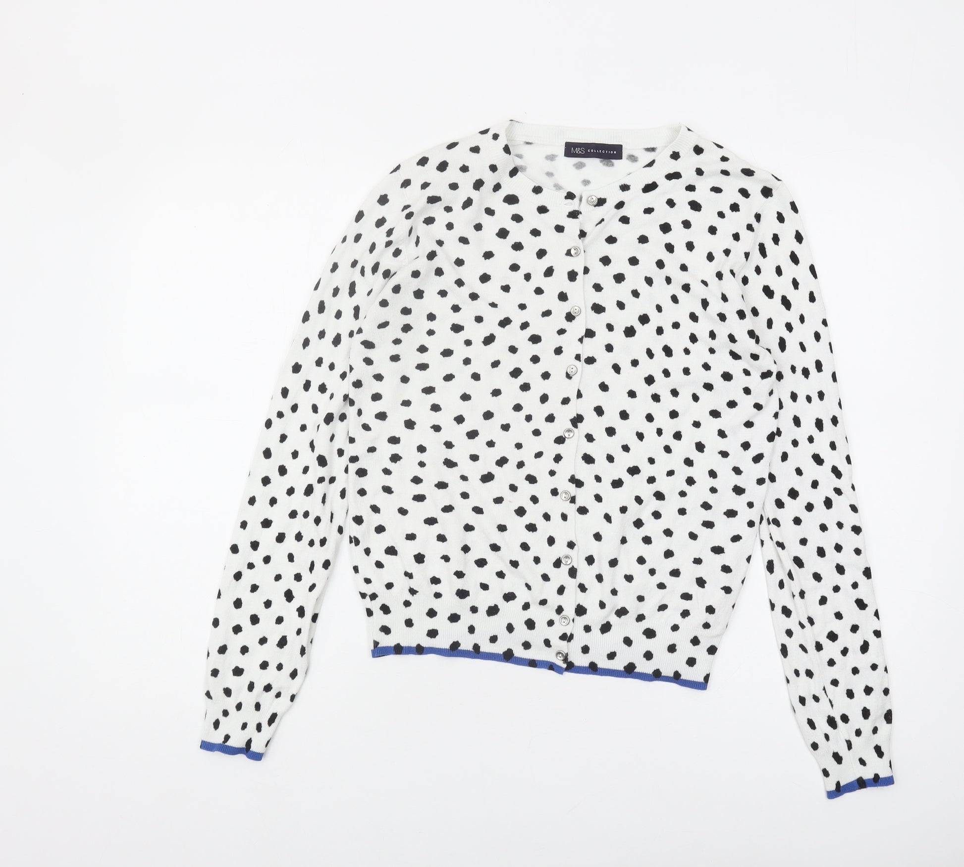 Elevate your wardrobe with this chic Marks and Spencer women's cardigan, perfect for adding a touch of elegance to your everyday attire. Crafted from a soft and comfortable knit fabric, this cardigan features a delightful black polka dot pattern on a classic white background. With a regular fit and size 12, it offers a flattering silhouette for women seeking both style and comfort.The cardigan's crew neck design adds a timeless touch, while the long sleeves provide coverage and warmth during cooler days. Made from a high-quality blend of 82% viscose and 18% polyamide, this piece ensures durability and easy maintenance with its machine washable care.Ideal for casual occasions, this versatile cardi can effortlessly transition from day to night, whether you're heading to work or enjoying a relaxed weekend outing. Its excellent condition suggests minimal wear, making it a valuable addition to any fashion-forward wardrobe.Don't miss the opportunity to own this stylish Marks and Spencer polka dot cardigan, which combines elegance and comfort in one must-have piece. Complement your outfit with bold accessories or keep it simple for a classic look. Shop now and let this cardigan become a staple in your closet, offering endless styling possibilities for every season.