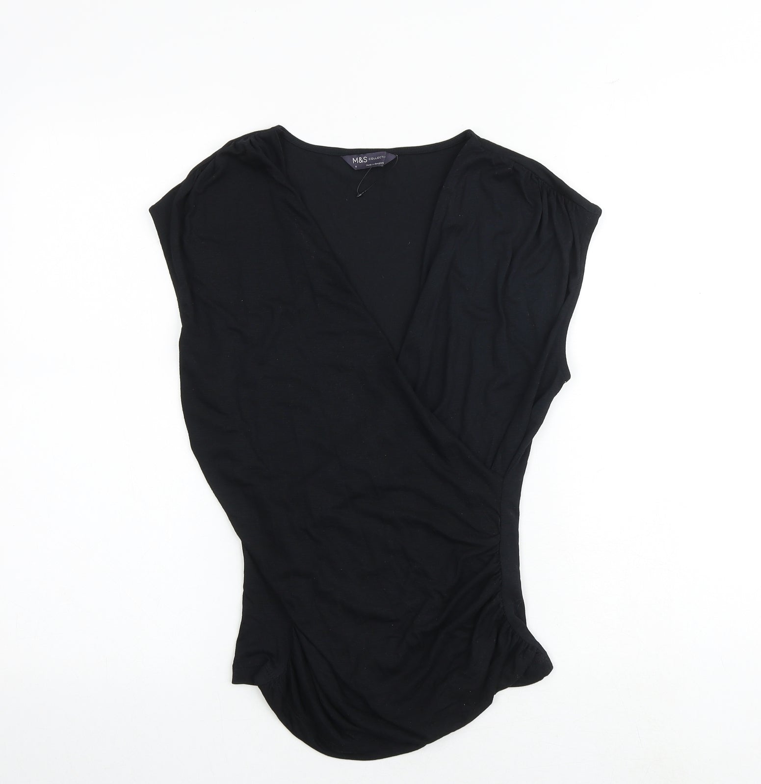 Womens Black Polyester Basic Blouse Size 8 V-Neck - Wrap Style Ruched