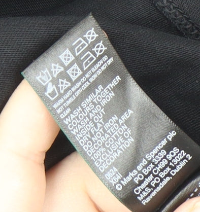 Enhance your wardrobe with this stylish Marks and Spencer Women's Black Rhinestone T-Shirt. The basic yet elegant design features a classic crew neck and short sleeves, making it perfect for any casual occasion. Crafted from 100% cotton, this t-shirt ensures breathability and comfort, providing all-day ease of wear. The black hue adds a versatile touch, effortlessly pairing with a variety of outfits from jeans to skirts. Featuring an eye-catching rhinestone accent, this top brings a subtle sparkle to your look, ideal for those days when you want to shine without going overboard. Additionally, the regular fit ensures a flattering silhouette for all body types. Designed with the modern woman in mind, this piece is machine washable, making it easy to care for and maintain its pristine condition. Its jersey fabric adds to the comfortable wearability, allowing for movement and flexibility whether you're at a casual meeting or enjoying a leisurely day out. With its tag still attached, it signifies a brand new garment ready to be added to your collection. At an affordable price of just £15.00, this t-shirt offers excellent value for quality fabric and design. Embrace a touch of elegance and make this versatile t-shirt a staple in your wardrobe.