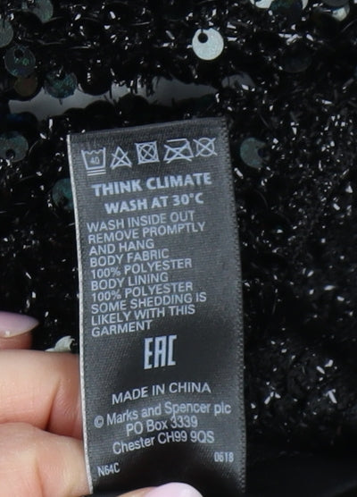 Discover a touch of glamour with this Marks and Spencer women's sequin top. Exquisitely designed in a chic black colour, it is perfect for special occasions or a stylish night out. The sparkling sequin accents add an elegant finish, while the long sleeves and round neckline ensure comfort and coverage. Tailored from high-quality polyester, this top is both durable and easily maintained, being machine washable. Secure fit with a button closure at the back. Ideal for cocktail parties or festive celebrations, this top will make you stand out with its sophisticated flair and shimmering presence. A must-have for your party wardrobe, offering the allure of sequins combined with the classic style of M&S.