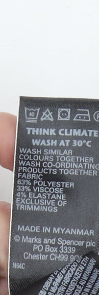 Step into effortless sophistication with these Marks and Spencer women’s black trousers, crafted to blend timeless elegance with everyday comfort. Tailored in a classic straight-leg silhouette, these trousers present a flattering mid-rise fit that works beautifully for both professional and smart-casual settings. Constructed from a quality blend of 63% polyester, 33% viscose, and 4% elastane, they offer a balance of durability, softness, and gentle stretch for ease of movement throughout your day. Designed in a sleek twill fabric with a smooth black finish, they maintain a polished look that stays sharp from morning to evening. The trousers feature a structured waistband with belt loops, a flat front design, and zip closure, all contributing to a refined and professional appearance. Their easy-care, machine-washable fabric makes them a convenient choice for busy modern lifestyles, while the stretch composition adds comfort for long hours of wear. These versatile trousers are ideal for business meetings, formal occasions, or daily workwear, pairing seamlessly with blouses, knitwear, or tailored jackets. The straightforward design ensures they remain a wardrobe essential that transitions effortlessly between seasons, particularly autumn through winter and early spring. Lightly worn but in excellent condition, they retain their original quality and structure without any notable signs of use. Ideal for the woman who values practicality as much as style, these Marks and Spencer trousers promise confidence and sophistication for years to come. Whether you’re dressing for the office or creating a refined evening outfit, these trousers provide a versatile foundation for any smart look. Add them to your collection for an investment in timeless style that’s as functional as it is elegant.