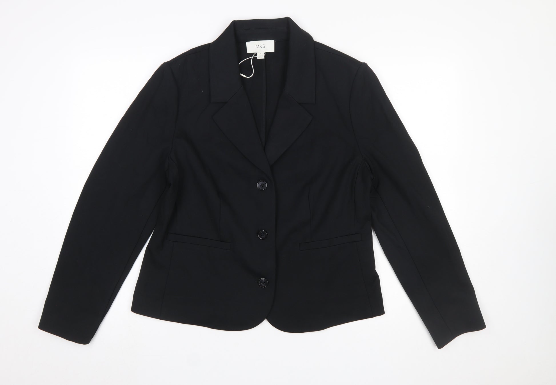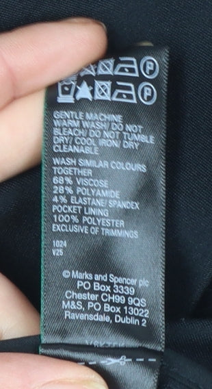 This elegant Marks and Spencer women's black suit jacket is a sophisticated wardrobe staple designed for both style and comfort. Expertly tailored from a soft blended fabric of viscose, polyamide, and elastane, it offers just the right amount of stretch for a flattering fit. The jacket features a single-breasted cut with a two-button front closure, structured notch lapels, and lightly padded shoulders, giving it a professional and refined silhouette. With front flap pockets and a fully lined interior, it ensures durability and comfort throughout the day. The timeless black colour makes it a versatile piece suitable for multiple occasions, from formal office wear to smart evening or business events. The long sleeves and classic fit provide a polished look, while the mid-length cut suits all body shapes, ensuring a smooth and tailored finish. Ideal for year-round wear, this jacket’s lightweight material makes it perfect for layering over blouses, shirts, or dresses. Whether paired with matching trousers or a pencil skirt, this Marks and Spencer jacket delivers effortless sophistication and exceptional quality that the brand is well known for. A must-have addition to any professional wardrobe, this piece combines durability, comfort, and timeless style. In excellent pre-owned condition with minimal signs of wear, this jacket is ready to add a touch of class to your outfit for work, business meetings, or formal functions. Practical yet chic, it embodies understated elegance with premium fabric and expert craftsmanship.