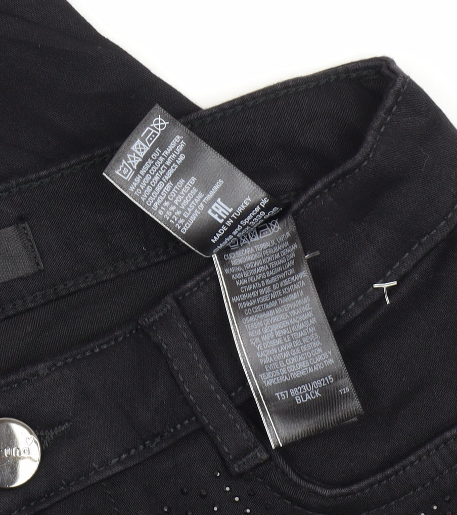 Enhance your wardrobe with these stylish Marks and Spencer Women's Straight Jeans in classic black. Perfect for any occasion, these jeans offer a regular fit, ensuring you move comfortably throughout your day. Made from a blend of cotton, polyester, and elastane, the fabric is both durable and stretchy, providing a flattering fit that accentuates your silhouette. The classic 5-pocket design adds both style and functionality, while the studded accent on the pockets adds a touch of elegance. With a reliable button closure, these machine-washable jeans are easy to care for, making them a practical choice for everyday wear. Whether you're heading to a casual outing or a more formal event, these jeans are a versatile addition to your collection, ideal for all seasons. Their excellent condition and medium fabric wash ensure they will remain a staple in your wardrobe for years to come. Don't miss out on owning this essential piece of clothing available now at a competitive price. Elevate your fashion game with these must-have jeans from a trusted brand.