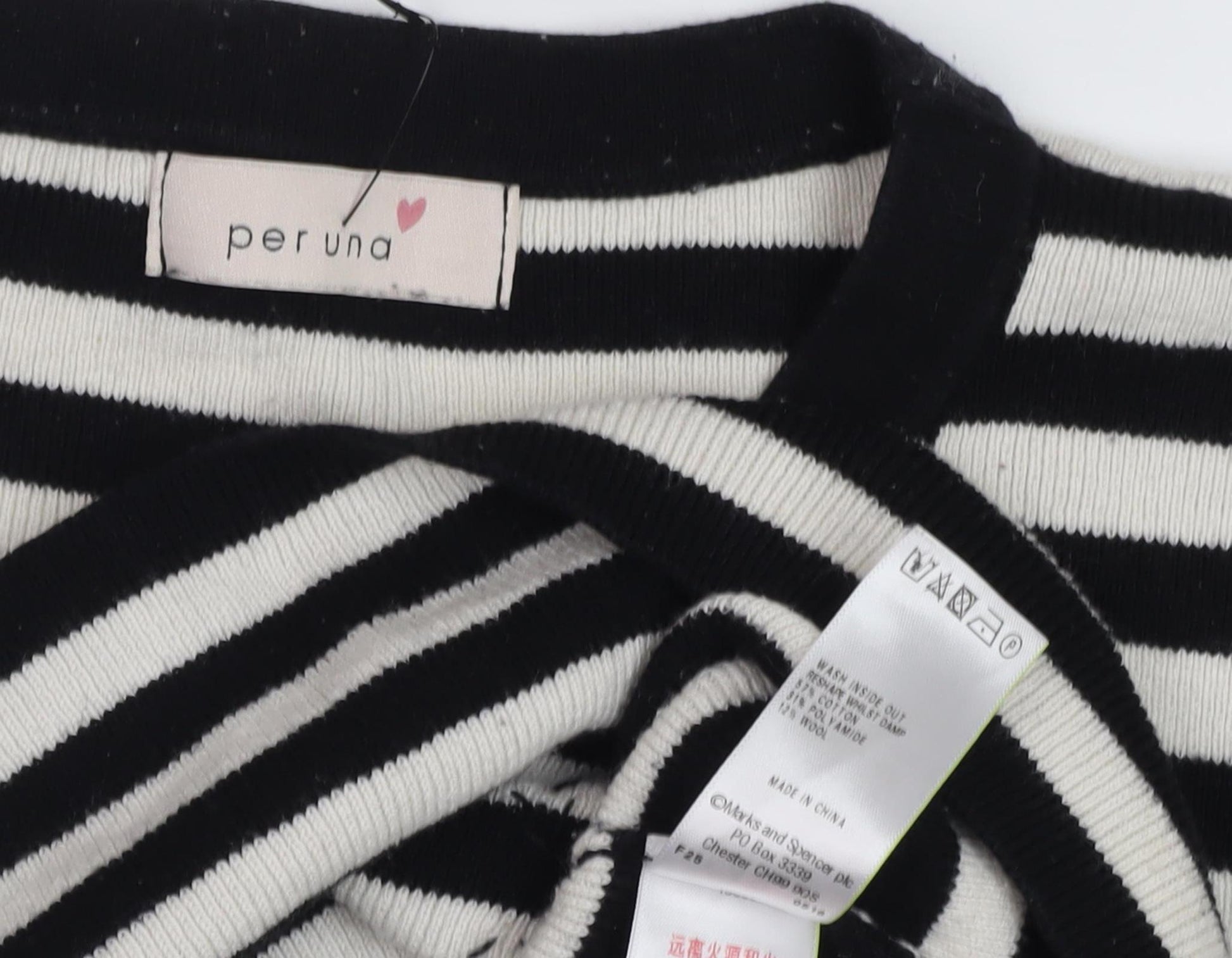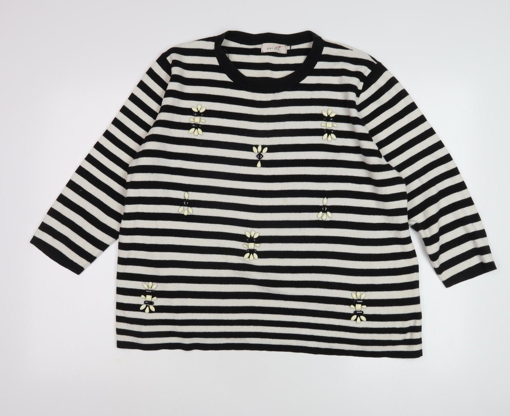 This captivating Marks and Spencer women's black striped pullover, in size 18, is a stylish addition to any wardrobe. Crafted from a comfortable blend of cotton, nylon, and wool, this jumper ensures both warmth and breathability. The crew neckline and 3/4 sleeves offer a classic look, suitable for a casual setting. Featuring a chic striped pattern and tight-knit style, this jumper accentuates a regular fit, effortlessly enhancing your everyday ensemble. The embroidered accents add a subtle touch of elegance and sophistication. With its machine washable care instructions, maintenance is a breeze, allowing you to enjoy this garment time and time again. Although exhibiting no visible flaws, this jumper remains in excellent condition, representing quality and durability synonymous with Marks and Spencer. Elevate your fashion game with this versatile and fashionable piece, perfect for a relaxed outing or a casual day at work. Don't miss out on the opportunity to own this superior quality jumper that combines style, comfort, and practicality seamlessly.
