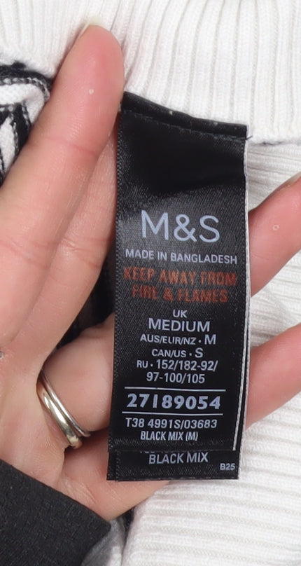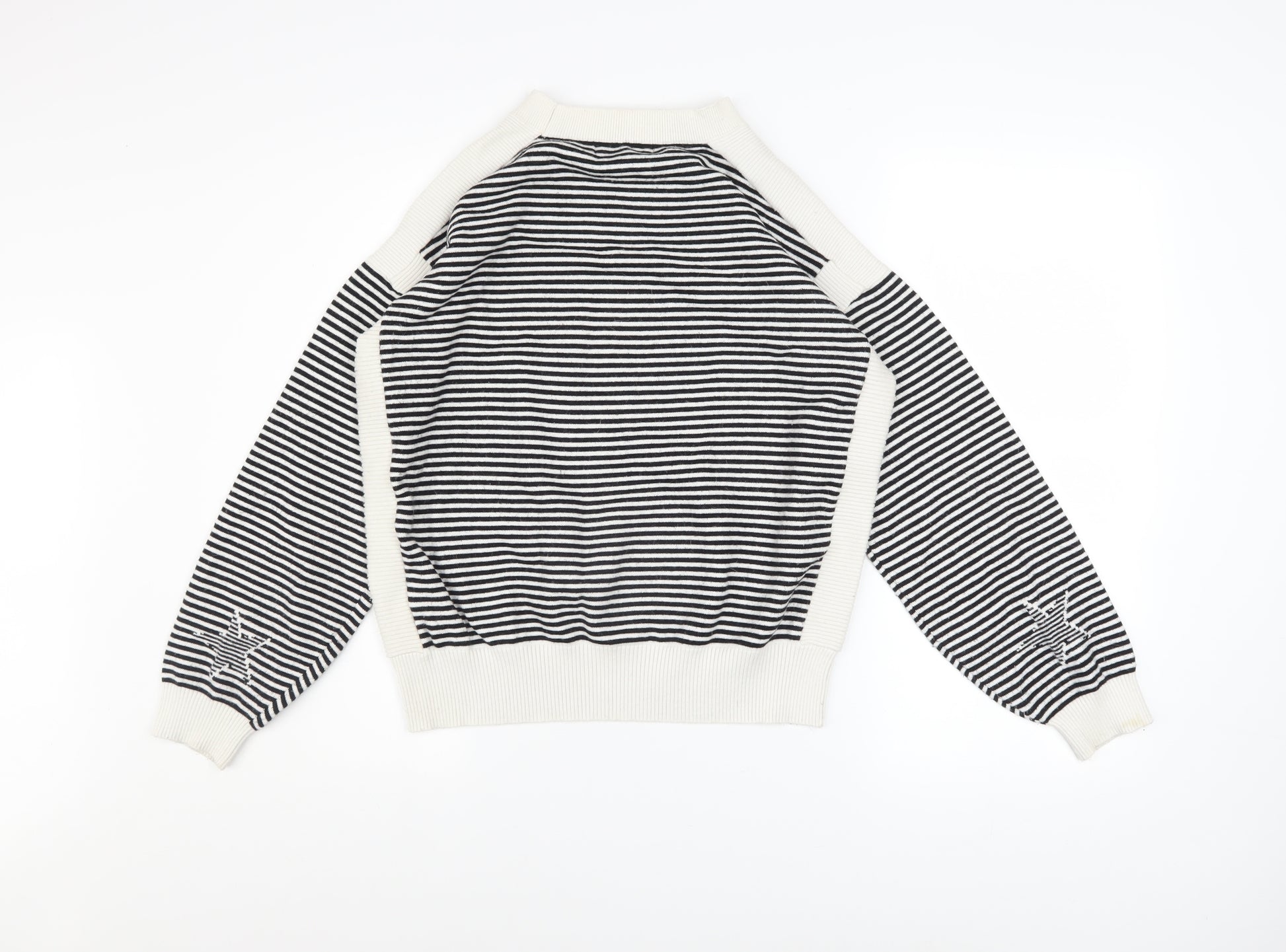 Add a touch of playful charm to your wardrobe with this cosy Marks and Spencer women's jumper in a flattering medium size. Crafted from a soft blend of viscose, polyester, and polyamide, this lightweight knit offers both comfort and lasting quality. The pullover style features a classic crew neckline with long raglan sleeves that provide ease of movement and a relaxed fit perfect for layering through cooler months. The chic black and white striped pattern is brought to life with delicate star embroidery accents, adding a subtle yet eye-catching twist to a timeless design. The ribbed cuffs, hem, and neckline enhance the fit while giving the jumper a polished finish. Designed for all-day comfort, this machine washable piece is easy to care for and ideal for casual days, weekend outings, or lounging at home. Wear it effortlessly with your favourite jeans or pair it with a midi skirt for a laid-back yet refined look. With its classic shape and versatile pattern, this Marks and Spencer striped star jumper will surely become a go-to piece in your autumn and winter collection. Although it remains in very good pre-owned condition, a small mark on the cuff is noted, reflected in the excellent value price. A delightful jumper that balances comfort, quality, and playful style from one of the UK’s most trusted brands.