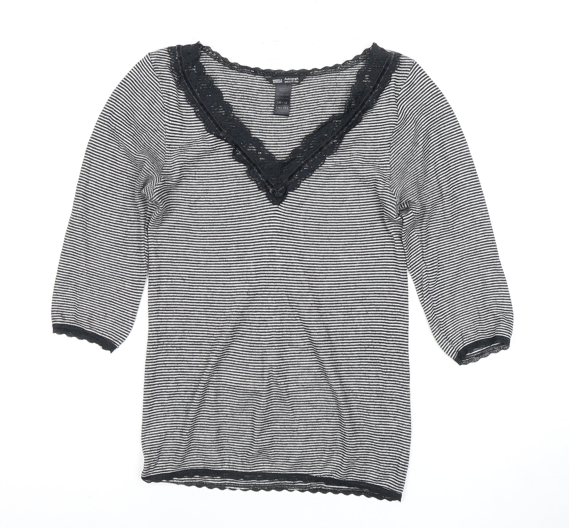 Discover a blend of comfort and style with this Marks and Spencer women's top, featuring a classic striped pattern in elegant black. Designed for versatility, the 3/4 sleeve length and V-neckline are complemented by delicate lace accents, adding a touch of sophistication to your everyday look. Crafted from a high-quality viscose and polyester knit fabric, this top drapes beautifully on a regular fit, ensuring both comfort and style. Ideal for autumn and winter wear, it pairs effortlessly with jeans for a casual day out or can be layered for a cozy evening ensemble. The machine washable material makes maintenance a breeze, allowing you to focus on enjoying the look and feel of your new favourite top. Embrace practicality without compromising on style with this stylish piece, perfect for a variety of occasions.