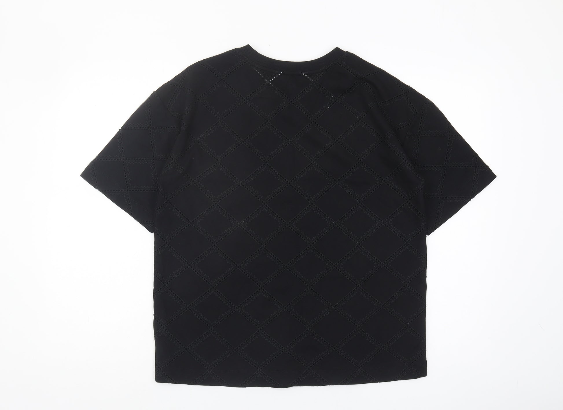 This timeless Marks and Spencer women's black T-Shirt is a must-have for any wardrobe. Designed with a regular fit, this short sleeve tee offers a classic crew neckline and is perfect for everyday wear. Crafted from a soft and comfortable blend of 78% cotton and 22% polyester, this top ensures both comfort and durability, making it a staple choice for almost any occasion. Its solid black colour provides versatility, allowing it to be easily paired with your favourite jeans or skirts. Ideal for layering or wearing alone, this T-Shirt is machine washable for easy garment care. Despite the absence of tags, the shirt is well maintained, reflecting an excellent pre-loved condition. Elevate your casual looks with this sophisticated yet simple piece.