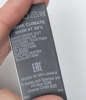 Upgrade your casual wardrobe with this classic black T-Shirt from Marks and Spencer, an essential piece for any fashion-conscious woman. Crafted from a comfortable blend of viscose and elastane, with added polyester for the sleeves, this round-necked top offers both style and comfort. Its soft jersey fabric ensures a breathable fit that's perfect for everyday wear, making it an ideal choice for all seasons. The regular fit design comes in UK size 18, perfectly tailored for a relaxed, comfortable silhouette. This top features classic short sleeves and a timeless solid pattern, allowing it to pair effortlessly with any ensemble, whether for a weekend outing or a relaxed day at home. Ensure ease of care with machine washability, keeping maintenance simple. Ideal for those seeking a versatile addition to their wardrobe, this Marks and Spencer T-shirt exemplifies understated elegance and quality craftsmanship.