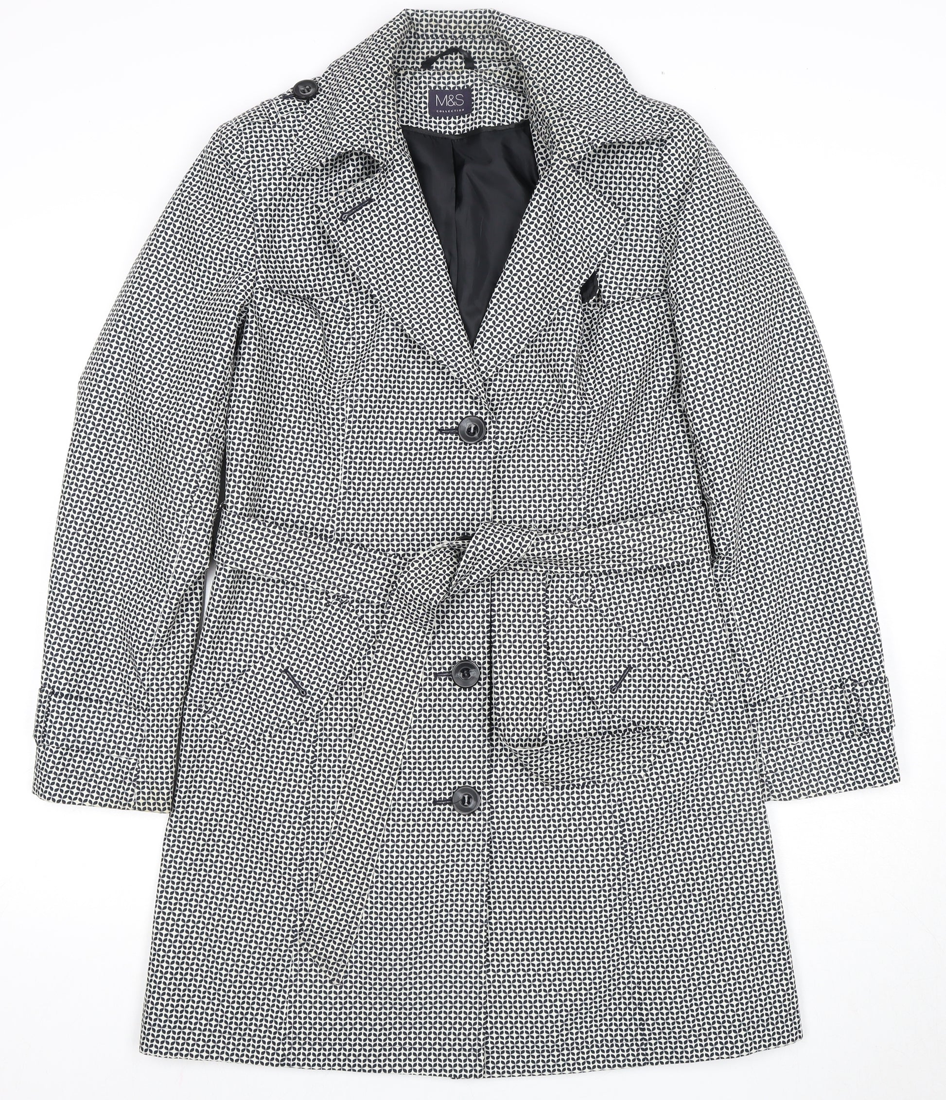 Step out in style and confidence with this elegant Marks and Spencer Trench Coat, perfect for both business and casual occasions. Designed for the modern woman, this black mid-length coat features a classic houndstooth pattern that adds a sophisticated touch to any outfit. Crafted entirely from polyester, it ensures durability while providing superior comfort and style. The coat's lined interior offers additional warmth and comfort, making it ideal for Autumn and Spring seasons. With its chic belted waist, it not only flatters your silhouette but also allows for a personalized fit. The collared neckline and secure button closure complete its timeless design, accentuating your look with a touch of classic elegance. Tailored in a regular fit, it offers ease of movement, while the long sleeves provide extra coverage. Easy to maintain with its machine washable fabric, this Marks and Spencer coat promises convenience without compromising on style. At an affordably chic price, this coat is a must-have staple for your wardrobe. Whether you're heading to a business meeting or enjoying a casual outing, this timeless trench coat will ensure you make a polished impression every time you wear it.