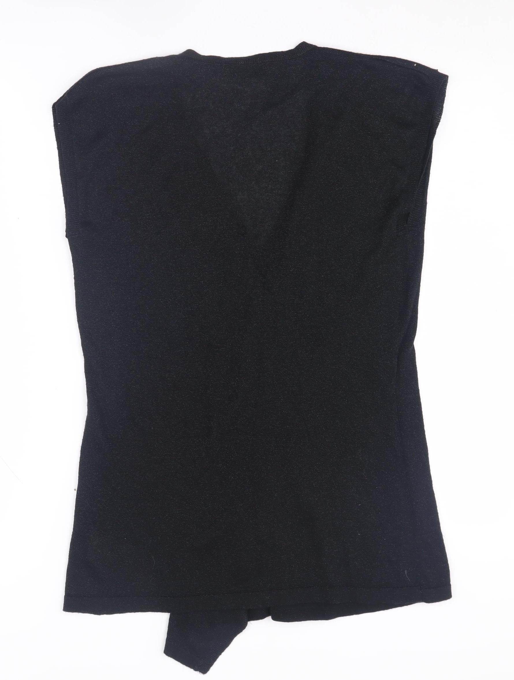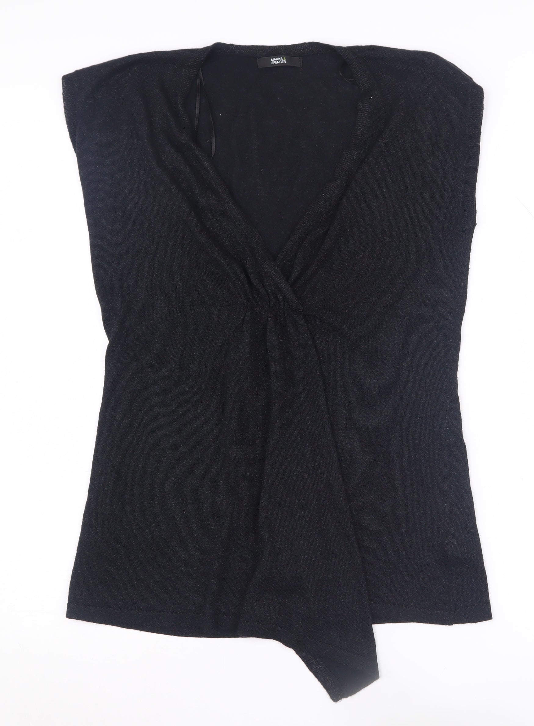 Discover the charm and elegance of this Marks and Spencer Women's Black Tunic, perfect for casual outings or a relaxed evening. Crafted with a luxurious blend of viscose and polyester, this jumper promises a silky smooth feel against your skin. The V-neck design adds a touch of sophistication, making it a versatile piece for layering over shirts or wearing on its own. Its regular fit and sleeveless style offer comfort and freedom of movement, ideal for all-day wear. Although pre-loved, this piece remains in excellent condition without any significant signs of wear. Whether paired with jeans or trousers, this jumper seamlessly blends into any outfit choice with ease, allowing you to showcase your style effortlessly. Perfect for the modern woman seeking a blend of comfort and class, this tunic is your go-to piece for understated elegance. Ideal for various casual occasions, enhance your wardrobe with this timeless garment, boasting an effortlessly chic look. Machine washable for easy maintenance, this Marks and Spencer creation is a staple addition to your knitwear collection. Don’t miss the chance to own a piece of stylish practicality that embodies quality and sophistication.