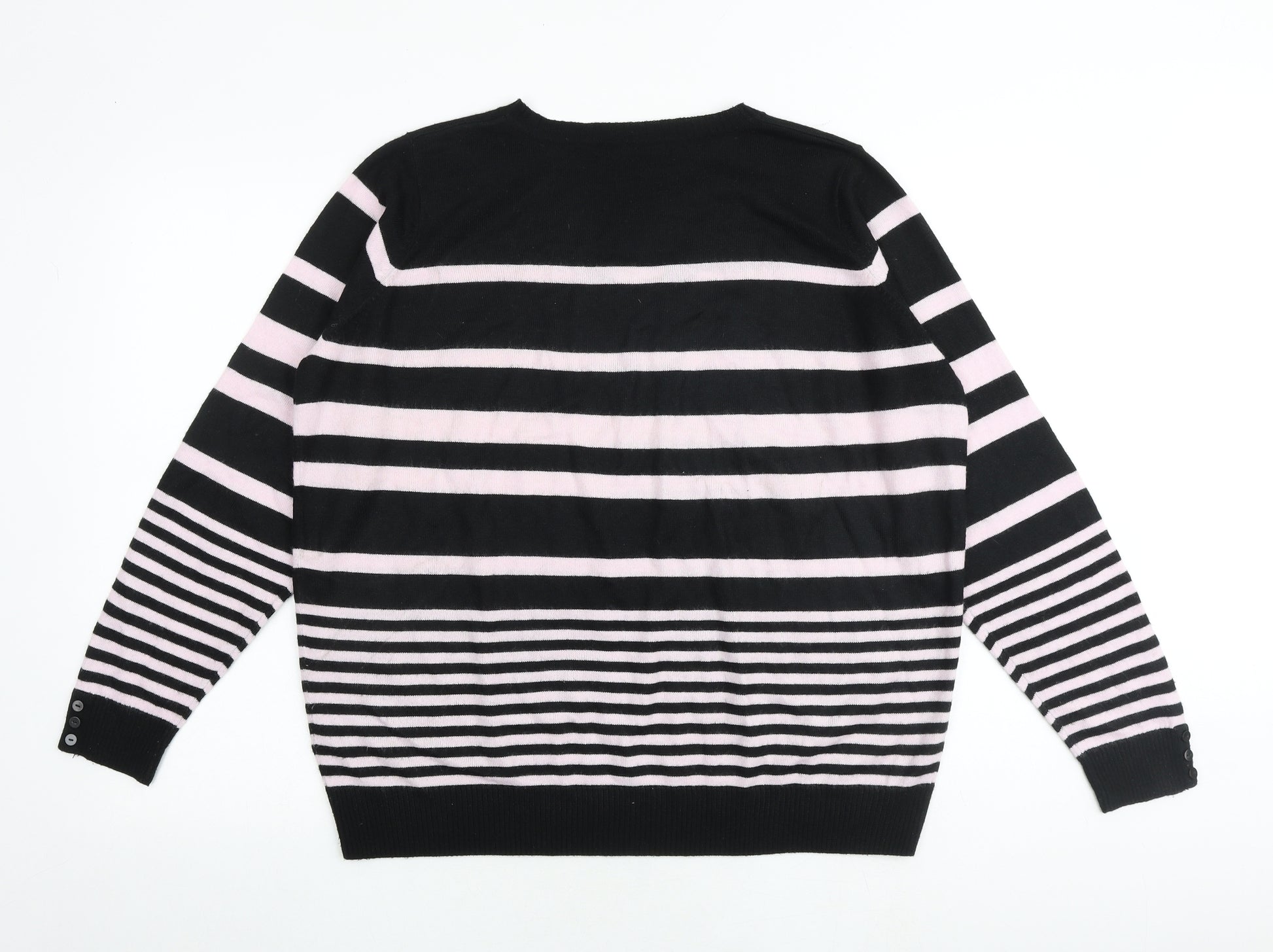 Womens Black V-Neck Striped Acrylic Pullover Jumper Size 18
