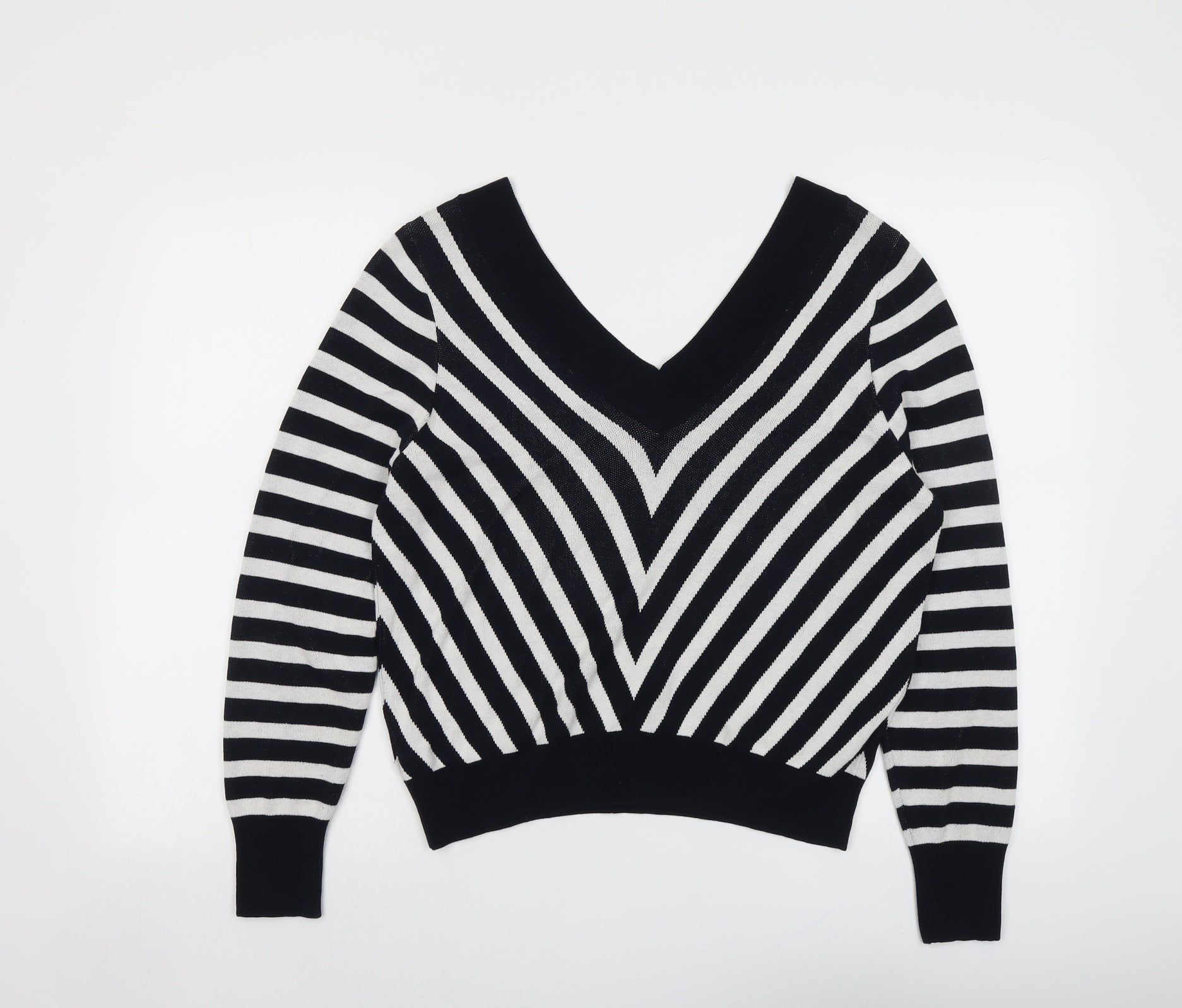 Womens Black V-Neck Striped Viscose Pullover Jumper Size 16