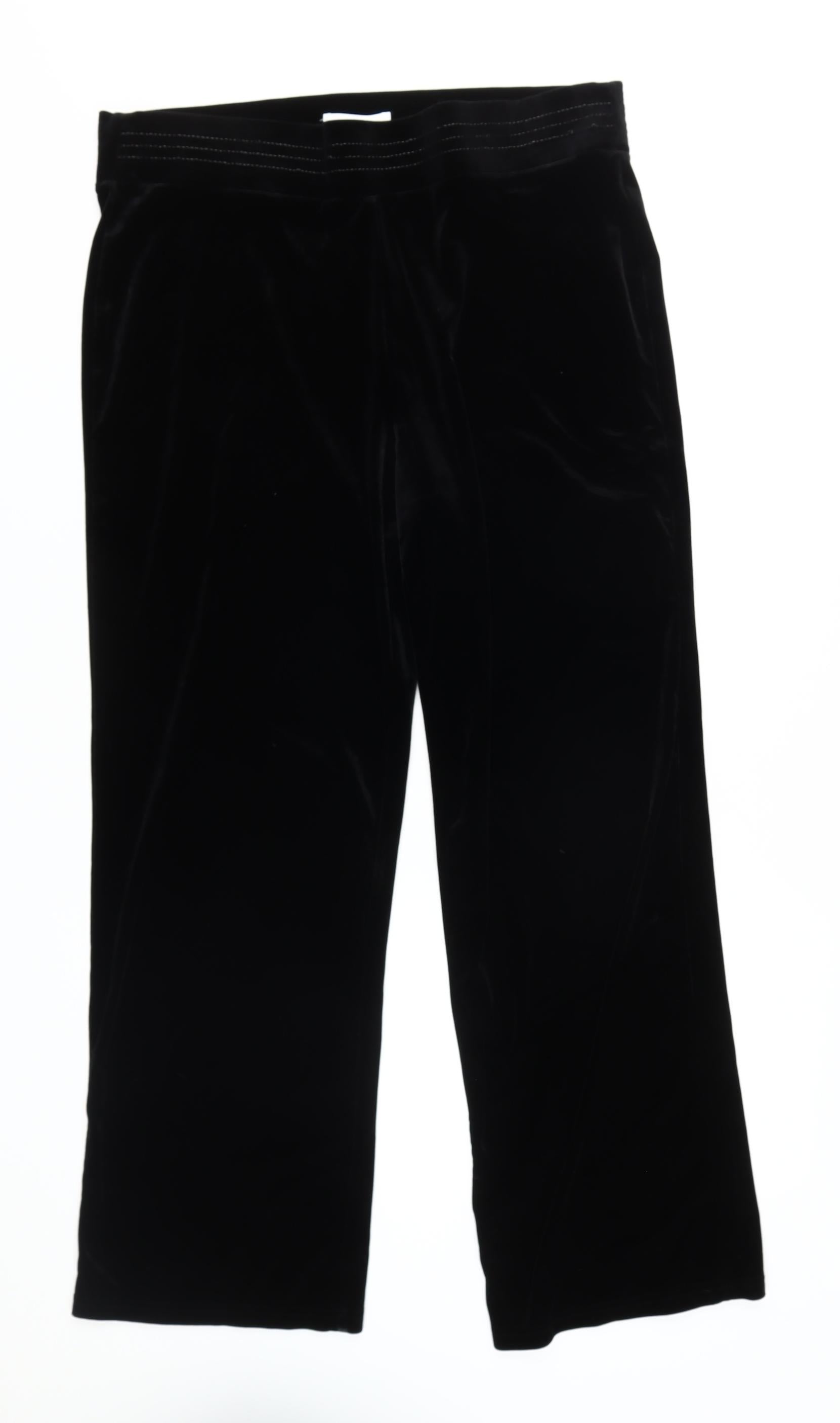 Elevate your wardrobe with these elegant black velvet trousers by Marks and Spencer, perfect for the crisp autumn and winter seasons. Designed for women, these trousers offer a regular fit and a straight leg style, making them an ideal choice for a casual look. The luxurious fabric type is velvet, providing a soft and warm feel that is excellent for cooler weather. Made predominantly of polyester and viscose, these trousers are machine washable, ensuring easy care and maintenance. With a UK size of 14, they cater to the regular size type, ensuring comfort and a flattering silhouette. The subtle design features a flat front and is devoid of any patterns, making it a versatile piece for pairing with various tops and accessories. Whether you're heading to a casual outing or enjoying a relaxed day at home, these trousers are a stylish and practical addition to any wardrobe. Being in excellent condition, they retain their charm with no visible signs of wear, allowing you to enjoy their timeless appeal without worry. Priced attractively, they represent both quality and value, making them a wise choice for fashion-forward individuals. Don't miss out on this opportunity to enhance your collection with a piece that combines style, comfort, and affordability.