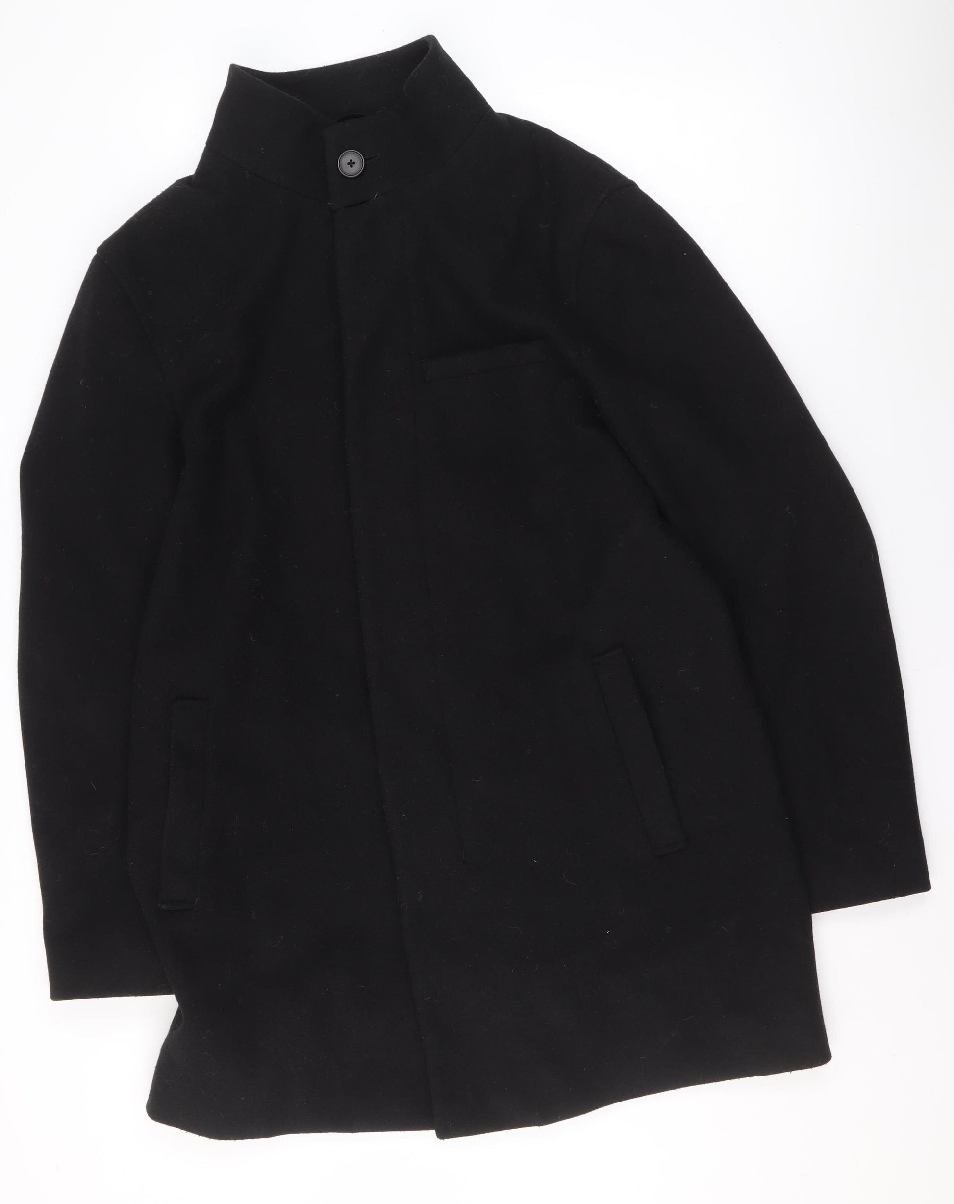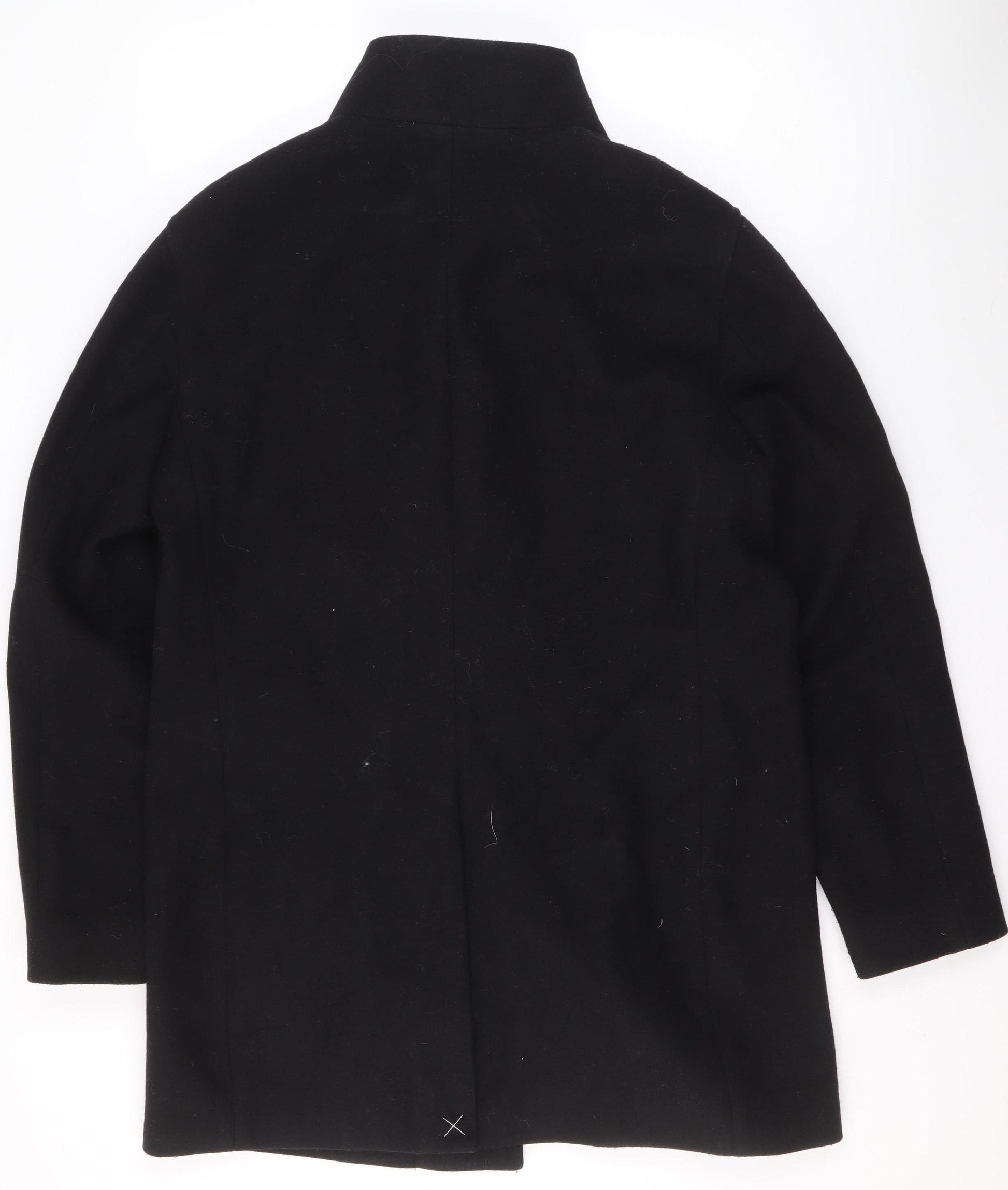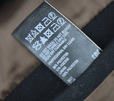 Step out in timeless elegance with this classic black wool blend overcoat from Marks and Spencer. Designed for women, this sophisticated piece offers both warmth and refinement. Crafted from a high-quality blend of 88% wool and 12% viscose, the coat provides a smooth, sturdy finish that ensures comfort and durability through colder months. The mid-length cut gives it a flattering silhouette, ideal for layering over business attire or casual wear on chilly days. The coat features a single-breasted front with a discreet button closure, adding a minimalist touch that keeps the look streamlined and polished. Practical front pockets provide functionality while maintaining the elegant aesthetic, making this an ideal choice for everyday wear, commuting, or professional occasions. The inside is fully lined with polyester to enhance comfort and ensure easy on-and-off wear over other clothing layers. The neat collar design frames the neckline beautifully, offering a refined edge that complements both scarves and high-neck knitwear. This Marks and Spencer women’s coat sits perfectly between structured fashion and timeless practicality. The premium wool blend ensures excellent warmth retention while remaining breathable, ideal for autumn and winter seasons. The sleek appearance and durable craftsmanship make it a wardrobe essential that can transition seamlessly between business, casual, and workwear occasions. Condition is rated excellent, showing only minor lint typical of wool fabrics. With its classic design and flattering fit, this black overcoat will quickly become your go-to outerwear for years to come. Elevate your cold-weather style effortlessly with this quality Marks and Spencer piece – a versatile, enduring choice that embodies understated British sophistication.