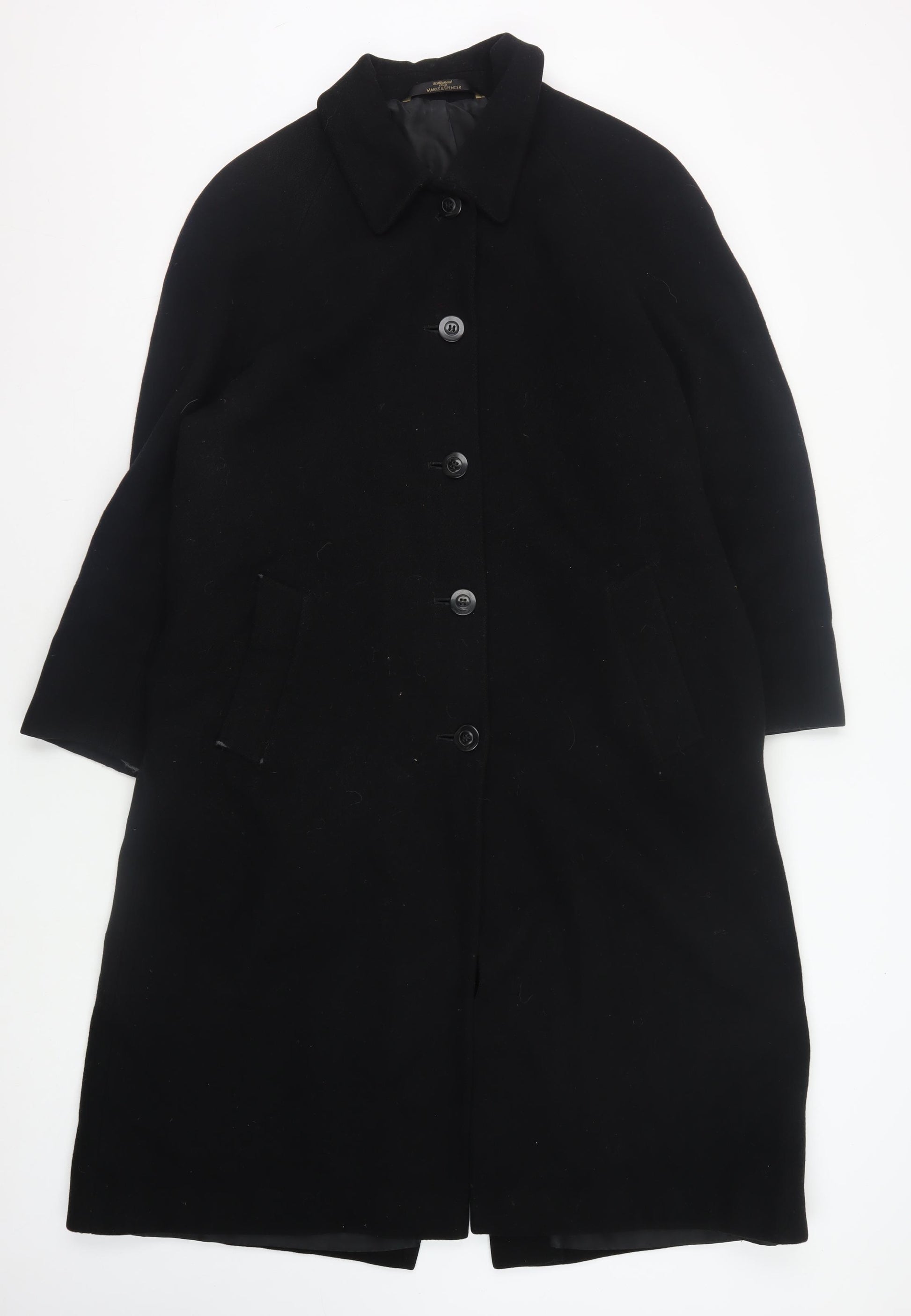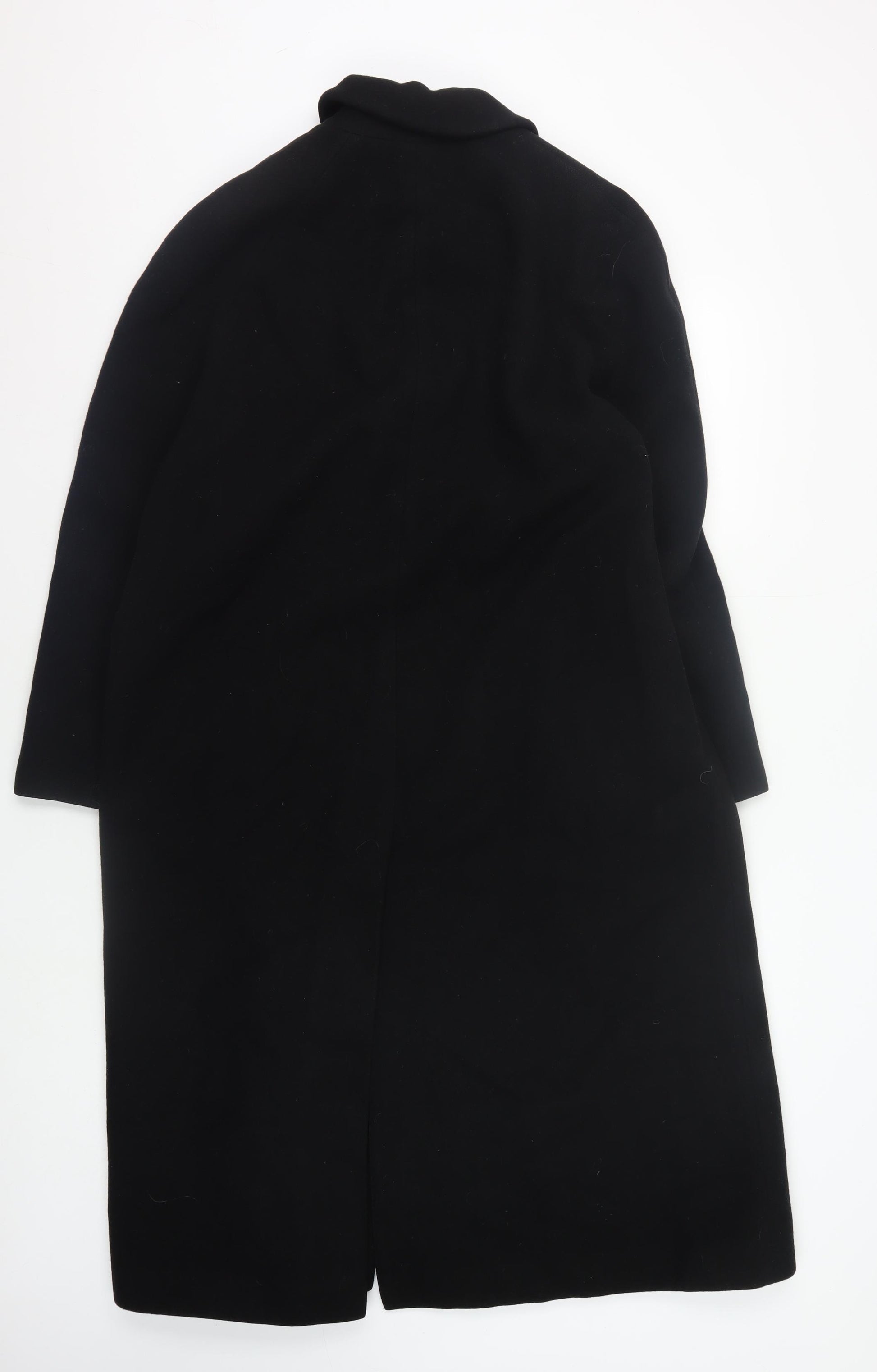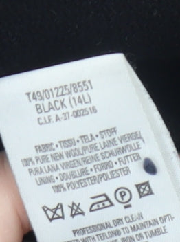 Step out with style and confidence with this timeless women’s black long coat from Marks and Spencer. Lovingly crafted from 100% pure wool, this coat not only promises warmth and comfort but also embodies elegance and sophistication, making it a perfect choice for both formal business meetings and casual outings. The coat features a classic single-breasted button closure, adding a touch of simplicity and practicality to its design, while the inner polyester lining ensures a smooth and comfortable fit throughout your busy day.Expertly tailored to cater to women who appreciate classic fashion elements, this piece works harmoniously with various themes and outfits, whether you're dressing up for a special formal occasion or need something versatile for everyday wear. The refined collared, lined design captures the essence of contemporary chic, ensuring you remain stylishly covered during the blustery autumn and chilly winter months.Specially engineered with long sleeves, this coat provides additional warmth, and the sleek no-pattern design enhances its universal appeal. Intricate button accents underscore its understated charm, making your outfit pop with each wear. Sized at 14, this regular fit coat assures optimum comfort without compromising on style, suiting both professional and personal style preferences. It's every fashionable woman's dream wrapped up in one stunning wardrobe essential, masterfully versatile to seamlessly adapt to various occasions.Please note, while this coat is in excellent condition, minor wear is visible, yet these gentle pre-loved signs enhance its uniqueness. Bring sophistication to your wardrobe and enjoy timeless fashion that’s designed to make an impression, whatever the occasion. Hand-wash only care instructions mean maintenance is simple, letting you focus on looking fabulous!