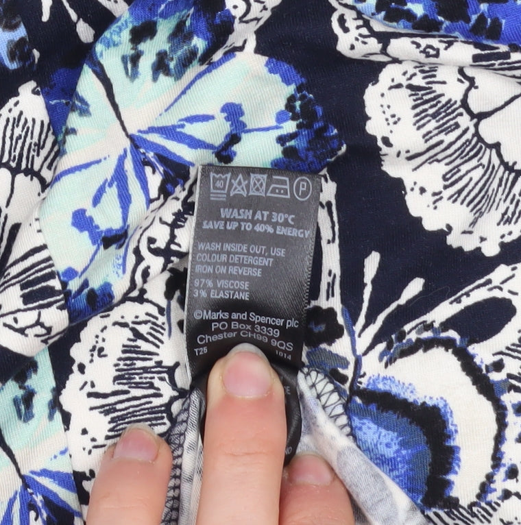 Brighten up your everyday wardrobe with this beautiful Marks and Spencer women’s tunic blouse, designed to offer both comfort and effortless style. Crafted from a soft blend of 97% viscose and 3% elastane, this top drapes beautifully while providing a gentle stretch for a flattering fit. The lightweight jersey fabric makes it breathable and comfortable to wear through the spring and summer months, ensuring an easy and relaxed look for both casual and semi-smart occasions. The blouse features a charming multicoloured butterfly and floral pattern in shades of blue, mint, and white on a dark background, adding a touch of vibrant yet sophisticated elegance. Its round neckline and 3/4 length fitted sleeves create a timeless silhouette that flatters all body shapes, while the soft A-line cut gently skims the hips for a comfortable and relaxed fit. The pullover style keeps it simple and fuss-free, ideal for easy dressing. Perfect for everyday wear, this Marks and Spencer tunic pairs beautifully with leggings, jeans, or slim trousers for a chic yet laid-back look. The machine washable fabric makes it convenient to care for, while its lightweight material ensures it remains a wardrobe staple throughout warmer months. In excellent pre-owned condition with no visible marks or damage, this top maintains the quality and craftsmanship you’d expect from Marks and Spencer. Whether you’re heading out for a lunch date, a casual day out, or simply relaxing at home, this versatile butterfly print blouse offers comfort, colour, and effortless style – making it a must-have addition to any wardrobe.