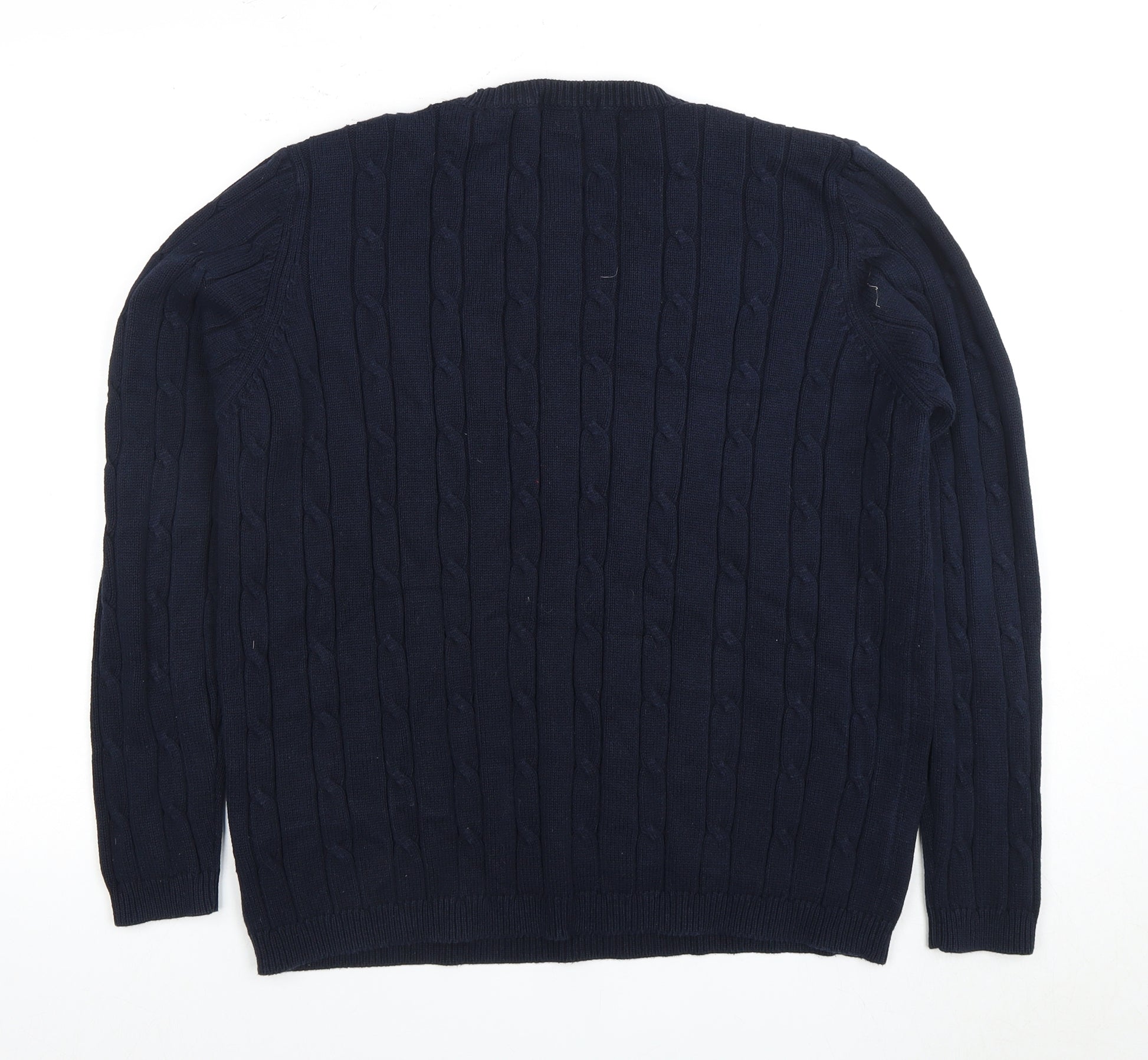 Elevate your winter wardrobe with this classic Marks and Spencer women's jumper. Crafted with a luxurious blend of cotton and polyamide, it ensures both warmth and breathability during the cooler months. The deep navy blue hue offers a versatile option that pairs well with a range of outfits, making it perfect for both casual and semi-formal occasions. Featuring a timeless cable-knit pattern, this jumper offers both style and comfort. The regular fit and crew neck design provide a universally flattering silhouette, while the long sleeves add extra warmth. The high-quality knit and durable construction ensure longevity, making it a staple piece in your collection for years to come. Designed for the contemporary woman, this jumper seamlessly blends fashion with function. Whether you're heading to the office or enjoying a weekend outing, its simplicity and elegance make it an effortless choice. Easy to care for, just toss it in the washing machine for convenient cleaning. Ideal for autumn and winter, this cable-knit jumper promises style without compromising on comfort. Despite slight wear marks, it remains in very good condition. Secure this staple piece and experience the enduring quality and style synonymous with Marks and Spencer.
