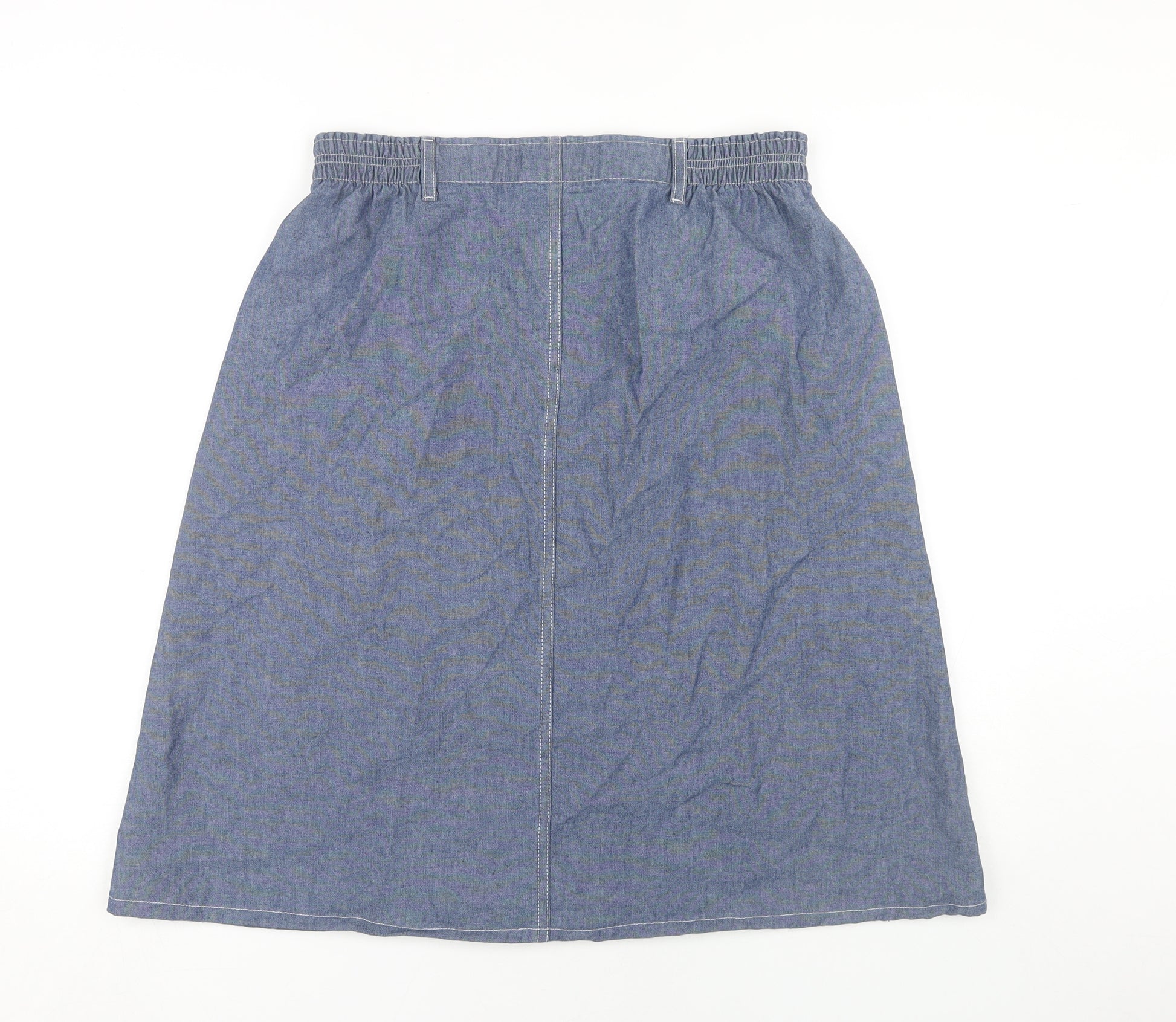Elevate your casual wardrobe with this classic Marks and Spencer blue chambray skirt. Crafted from 100% cotton, this knee-length skirt offers both comfort and style. Its elastic waist and button accents provide a perfect fit and easy wearability. Designed for women, the timeless straight & pencil style and regular size fit make it suitable for everyday wear. With practical pockets and a chic blue tone, it complements any casual outfit effortlessly. Ideal for all-season wear, it's machine washable for easy care. This versatile skirt is a staple piece for your wardrobe, perfect for casual outings or relaxed weekends.