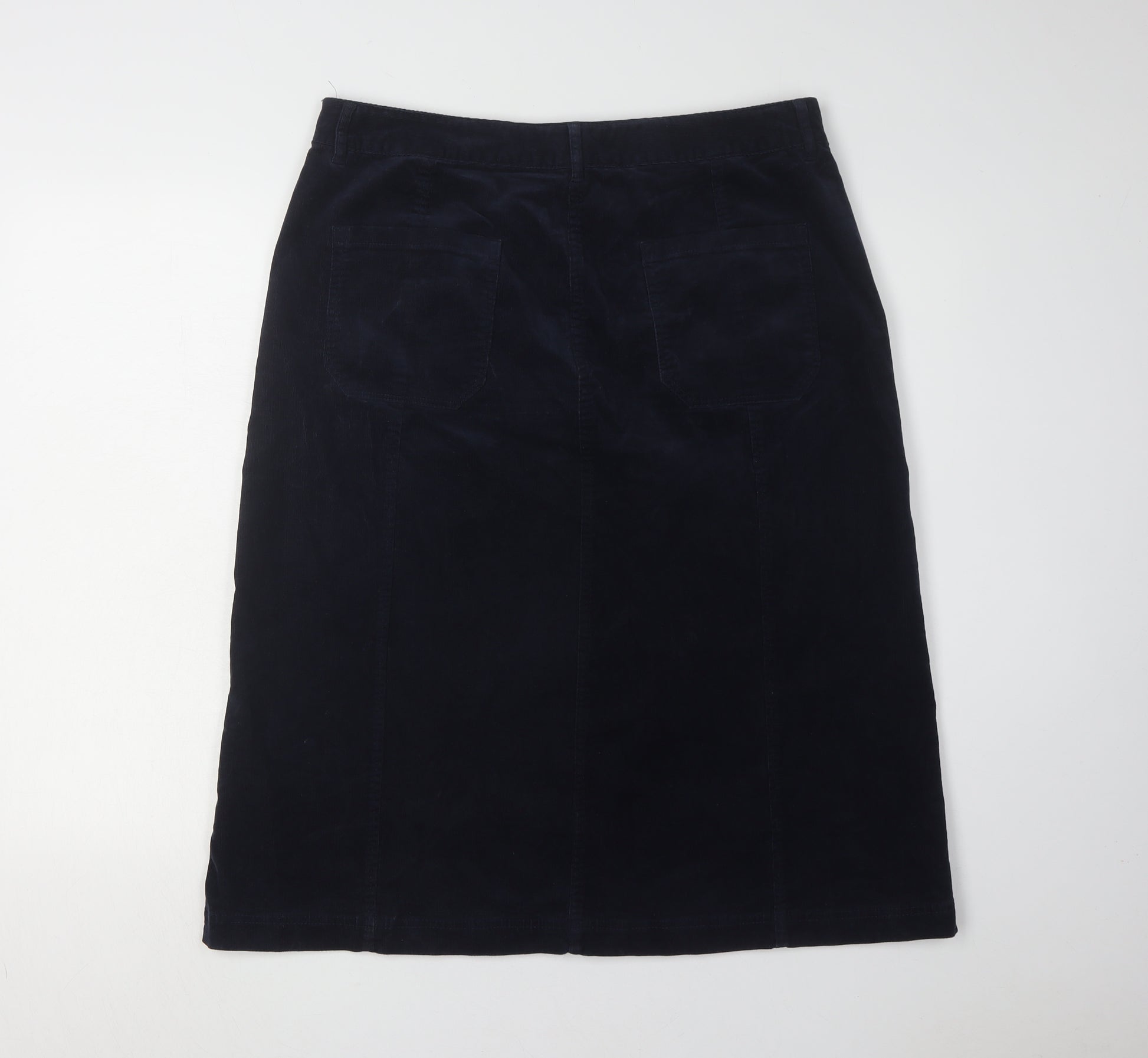 Discover timeless elegance with this Marks and Spencer Women's Blue Corduroy Skirt. Crafted for those who appreciate classic sophistication, this knee-length pencil skirt is an impeccable choice for casual and business settings alike. The skirt features a button-down front, adding a chic touch that accentuates its straight cut. Made predominantly from soft cotton mixed with modal and a hint of elastane, this skirt promises comfort with every wear. Its deep blue hue offers versatility, making it a staple piece for every wardrobe. Perfect for the autumn and winter seasons, the skirt pairs beautifully with both casual tees and elegant blouses, allowing for endless styling options. Easy to care for with machine washability, this item ensures convenience without compromising on style. Embrace the luxurious feel of corduroy coupled with the emblematic quality of Marks and Spencer. Ideal for those who prefer a minimalist design, the skirt carries no patterns, ensuring a clean, polished look every time. Invest in this essential piece for a sophisticated wardrobe update.