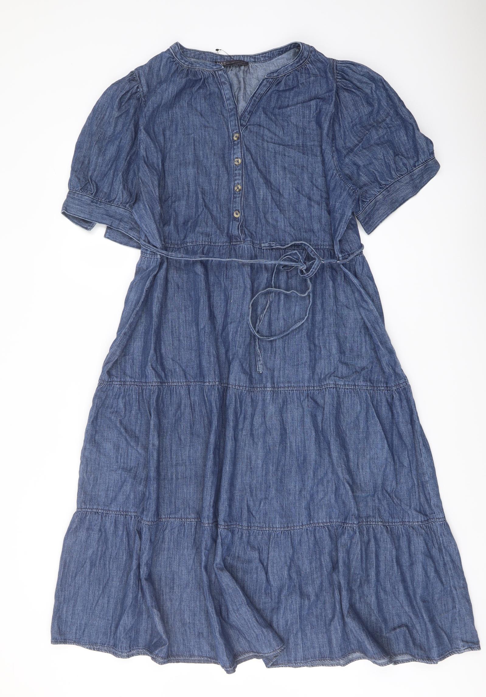 Womens Blue Cotton A-Line Size 18 V-Neck Button