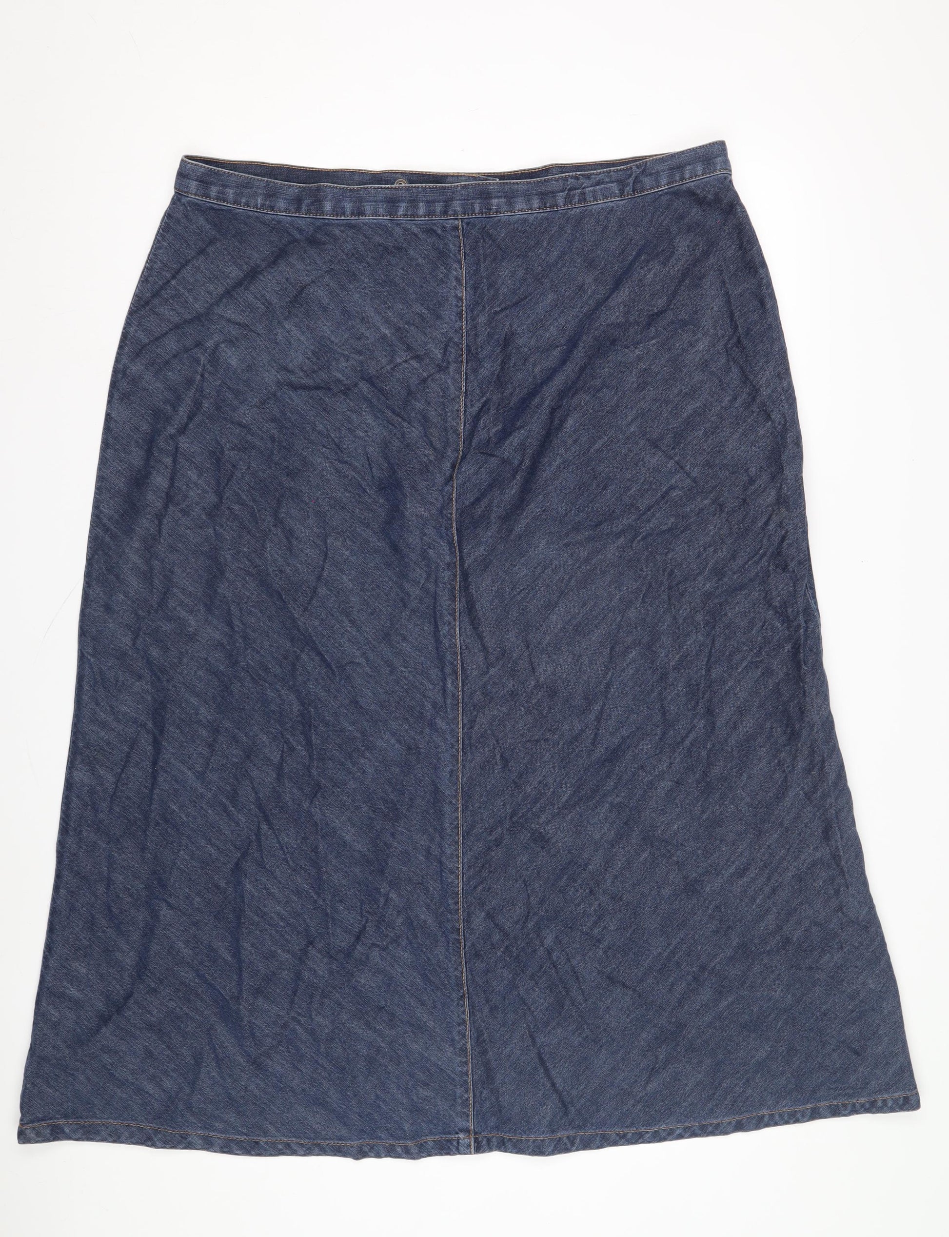 Elevate your everyday style with this versatile Marks and Spencer A-Line denim skirt. Perfect for women looking for a chic but casual look, this knee-length blue skirt is crafted from a durable blend of cotton and elastane, ensuring comfort and flexibility with every wear. The classic denim finish complements its timeless A-Line style, making it a wardrobe staple that you can pair with a variety of tops and accessories. With its mid-rise fit, it offers a flattering silhouette that suits a range of body types. Featuring practical pockets and secured by a button and zip closure, this skirt is as functional as it is stylish. Designed to suit the casual wearer, it’s ideal for autumn and spring outings, providing ease of movement and a fashionable look. Aside from a small stain and light signs of wear, this skirt is in very good condition, promising longevity when paired with care as per its machine-washable instructions. Embrace effortless style with this essential piece, whether you're heading to a casual lunch with friends or a relaxed day at work.