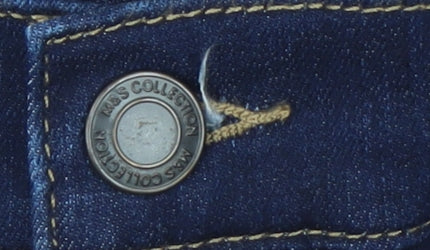 This stylish Marks and Spencer women's blue denim knee-length pencil skirt offers a timeless and versatile look, perfect for elevating your smart-casual wardrobe. Crafted from a comfortable and durable blend of cotton, polyester, and elastane, this stretch denim skirt provides a flattering fit that moves with you throughout the day. The cotton-rich fabric feels soft against the skin, ensuring breathability, while the slight elasticity adds ease of movement. Designed with a mid-rise fit and traditional five-pocket styling, it combines both practicality and effortless style. The button and zip fastening add to the classic denim appeal, complemented by subtle topstitch detailing and a small front slit that provides a feminine touch. This skirt is ideal for all seasons—pair it with tights and boots in the colder months or sandals and a light blouse during summer for a laid-back yet polished ensemble. The dark indigo blue hue gives it a sleek finish that can be dressed up or down depending on the occasion. Suitable for casual outings, everyday workwear, or smart-casual events, it’s a dependable staple for any wardrobe. The durable denim ensures lasting wear, making this a great addition for those who value both style and substance. Gently worn and well cared for, it remains in excellent condition with minimal signs of use. Its simple yet sophisticated design means it will never go out of fashion, offering great versatility for years to come. Add this classic Marks and Spencer denim pencil skirt to your wardrobe today for a perfect blend of comfort, quality, and effortless British style.