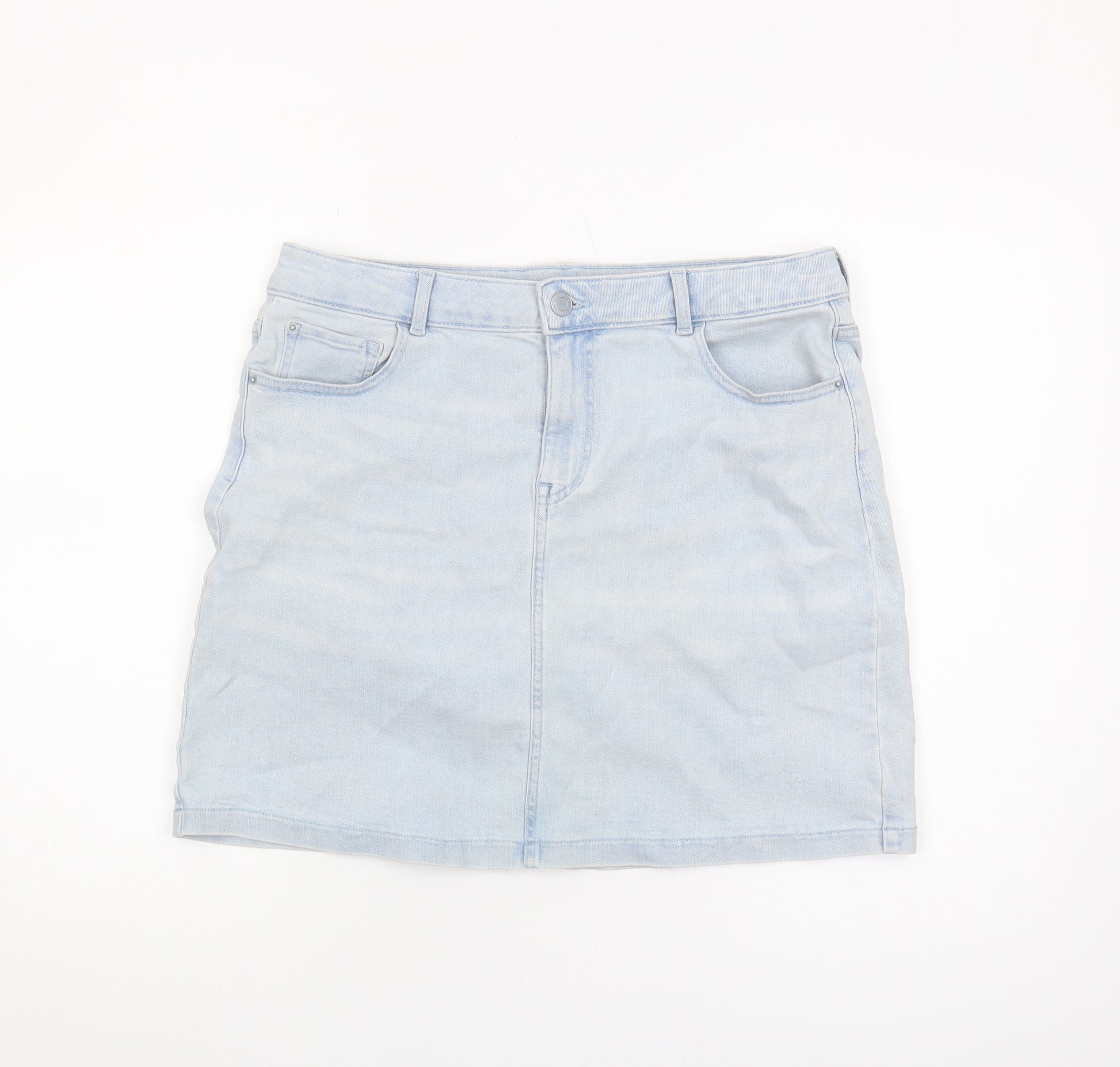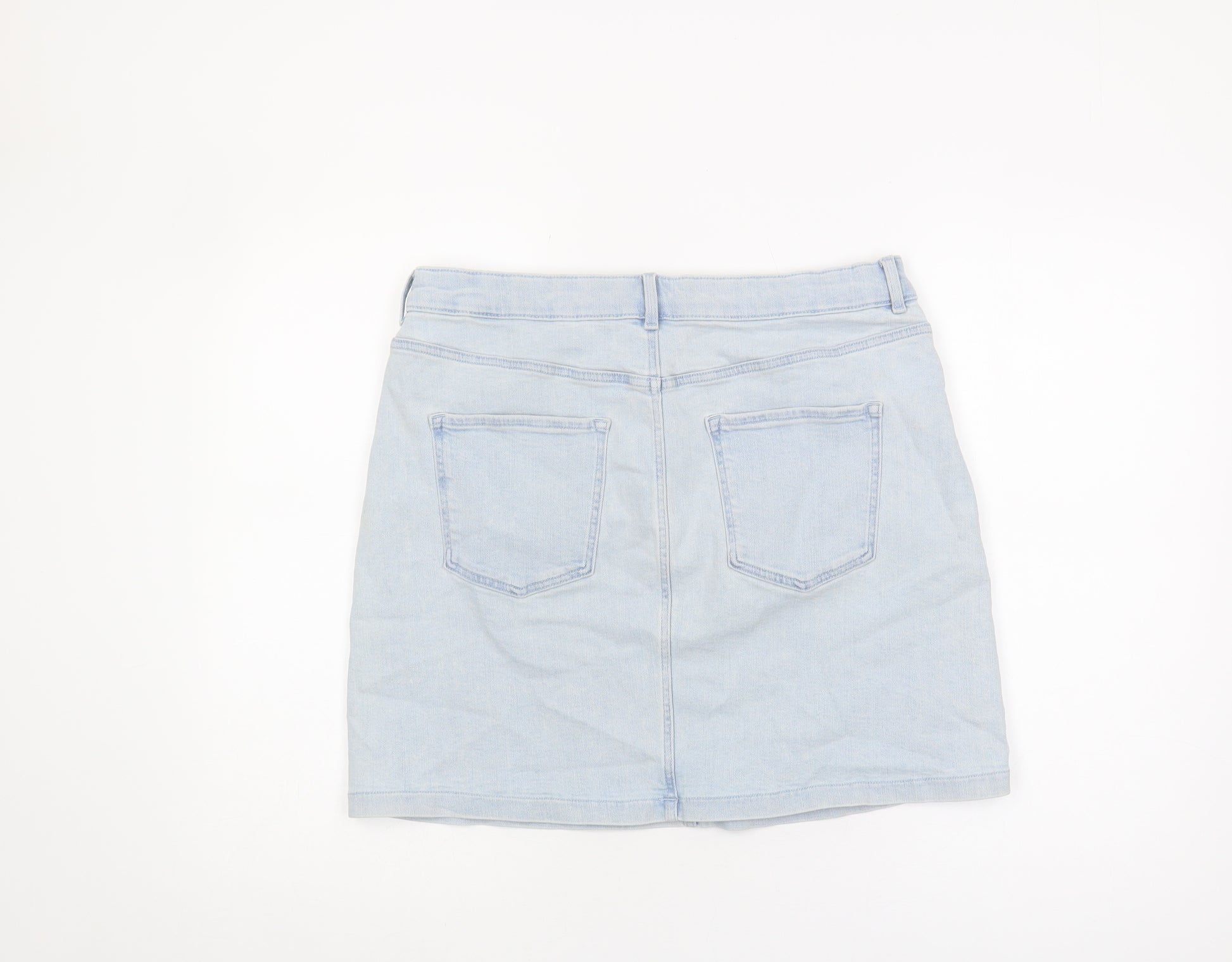 Elevate your casual wardrobe with this stylish light blue denim skirt from Marks and Spencer. Crafted for comfort and style, this women's skirt features a timeless straight pencil silhouette that complements every figure, while the stretchy denim fabric ensures a perfect fit. The skirt includes functional pockets for added convenience, making it both practical and fashionable. Ideal for any casual occasion, it can be paired effortlessly with a simple top or blouse. Its versatile design allows it to be worn year-round, transitioning seamlessly from season to season. Whether you're heading out for a casual day out or running errands, this skirt offers a chic, laid-back look that's both modern and classic. Made from 98% cotton and 2% elastane, it's machine washable for easy care. Despite being pre-owned, it appears in excellent condition with no visible damage. Don't miss the opportunity to add this versatile piece to your wardrobe.