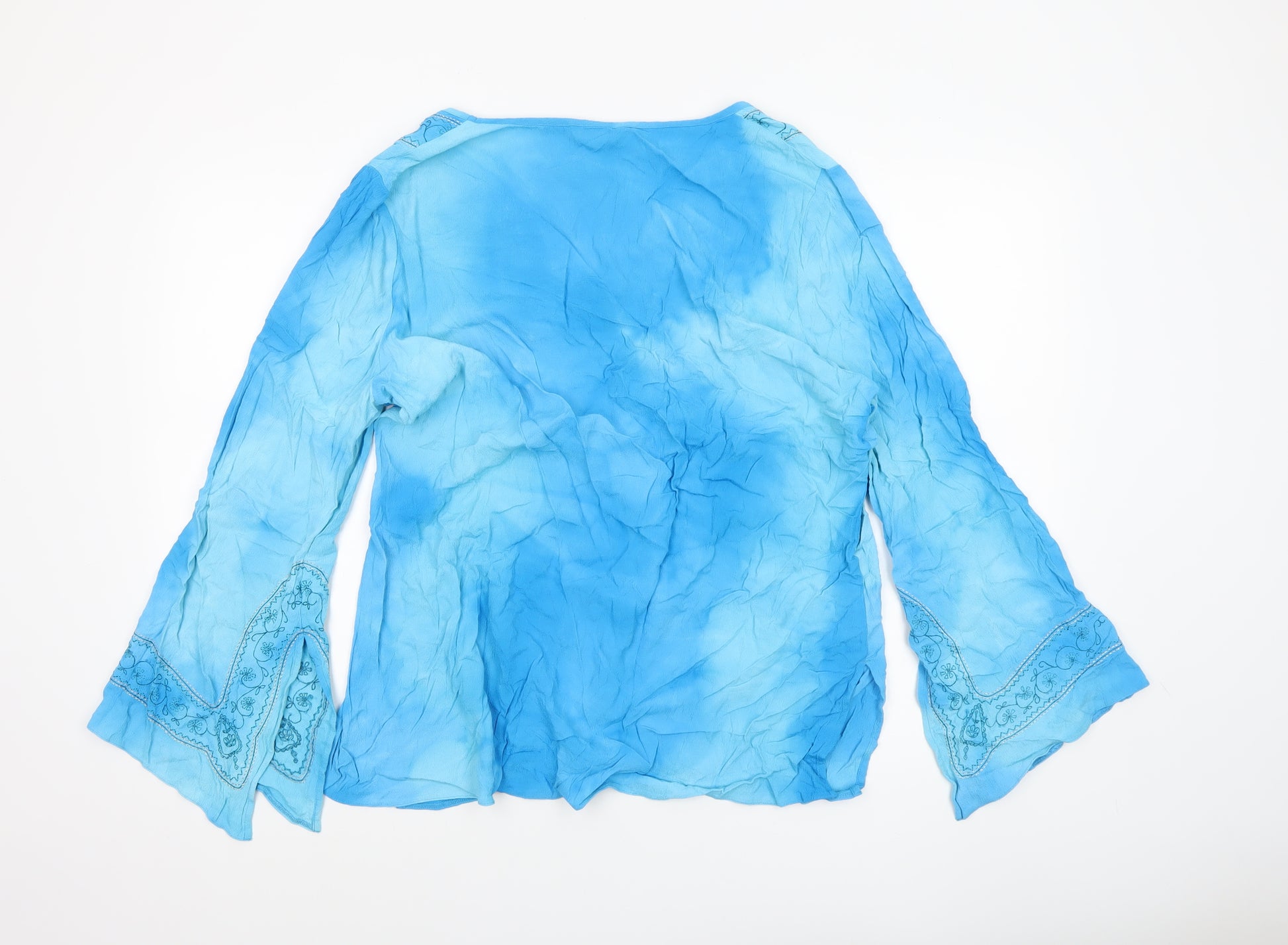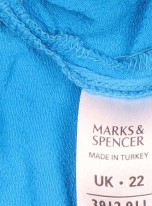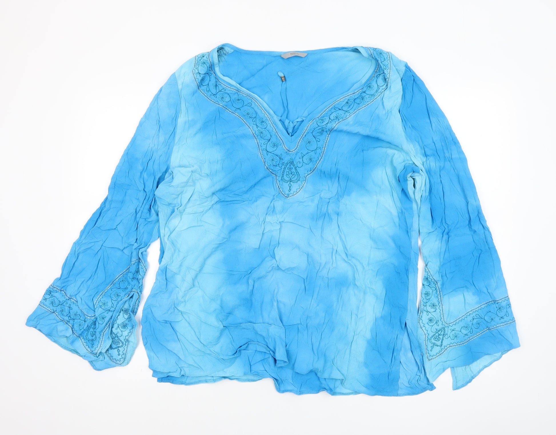 Add a burst of colour to your wardrobe with this beautiful blue tunic blouse from Marks and Spencer. Designed in a vibrant turquoise hue, this soft, lightweight top offers a flattering relaxed fit perfect for warm weather. The blouse features elegant embroidered detailing around the V-neckline and along the wide bell sleeves, adding a touch of bohemian charm to its timeless design. Made from 100% viscose, the fabric feels smooth and airy against the skin, providing both comfort and breathability throughout the day. The pullover style offers ease of wear, and the long sleeves make it versatile for layering or wearing on cooler summer evenings. Ideal for casual days, beach holidays or relaxed outings, it pairs effortlessly with jeans, linen trousers or skirts for an easy, chic look. Designed for women, the UK Size 22 fit ensures comfort without compromising style. The garment is machine washable, making it easy to care for and maintain its vibrant appeal. With a woven finish and lightweight fabric, this Marks and Spencer blouse captures a laid-back yet stylish vibe suitable for spring and summer wear. In very good pre-owned condition with only light signs of wear and some natural creasing from storage, it remains an elegant and wearable wardrobe piece. A perfect choice for those seeking a comfortable, breathable and feminine top that transitions seamlessly from day to evening. Embrace effortless style and enjoy the timeless quality of Marks and Spencer with this beautifully embroidered blue tunic blouse.