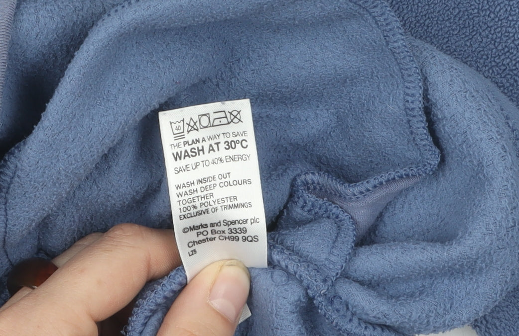 Introducing the Marks and Spencer Women's Blue Fleece Jacket, a versatile piece designed to complement your everyday wardrobe. This stylish jacket is crafted from soft fleece fabric in a calming blue hue, perfect for those who value both comfort and aesthetic appeal. Ideal for casual occasions, it features a regular fit with a full zip closure, making it easy to slip on and off as needed. The long sleeves provide ample coverage, while the mid-length cut ensures it pairs well with both jeans and trousers. Constructed from 100% polyester, this jacket is lightweight yet warm, offering a cozy layer for all seasons. It is machine washable, ensuring easy care and maintenance, and has been well-preserved to ensure excellent condition. Available in a size 14, it fits comfortably within the regular size range, catering specifically to women seeking a reliable go-to jacket. Whether you're stepping out for a walk in the park or running errands, this Marks and Spencer fleece jacket offers the ideal blend of style, functionality, and comfort. Make it a staple in your collection and enjoy its lasting quality for years to come.