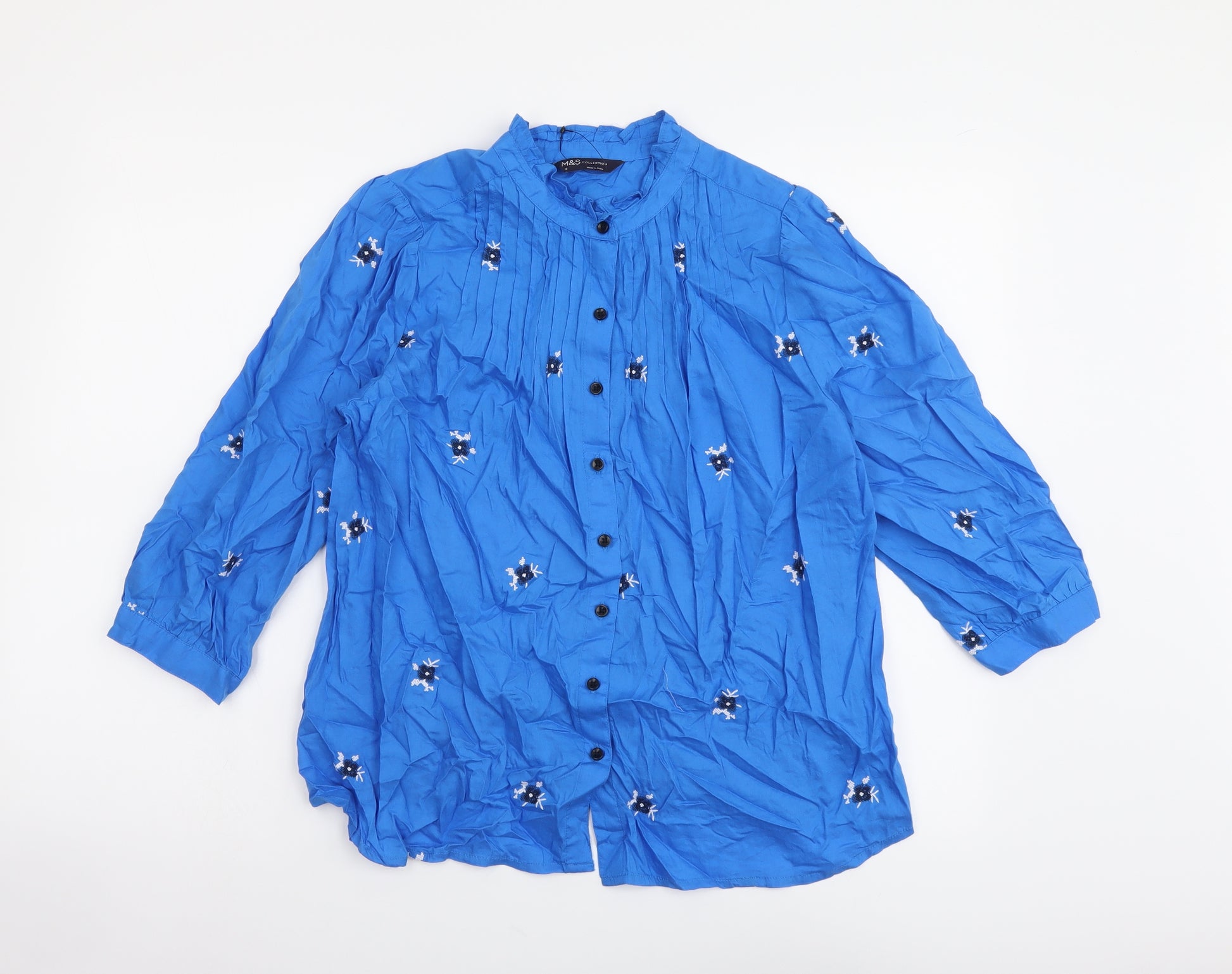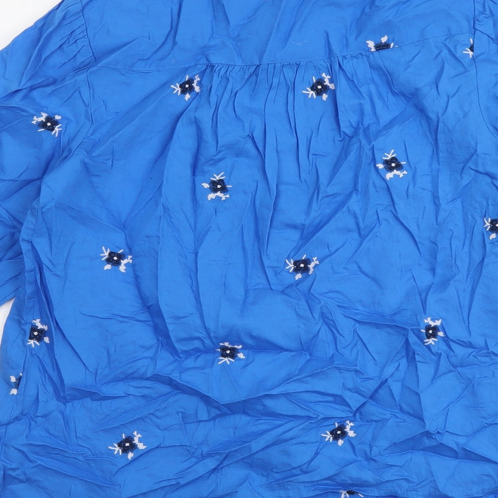 Womens Blue Floral Cotton Basic Button-Up Size 8 Round Neck
