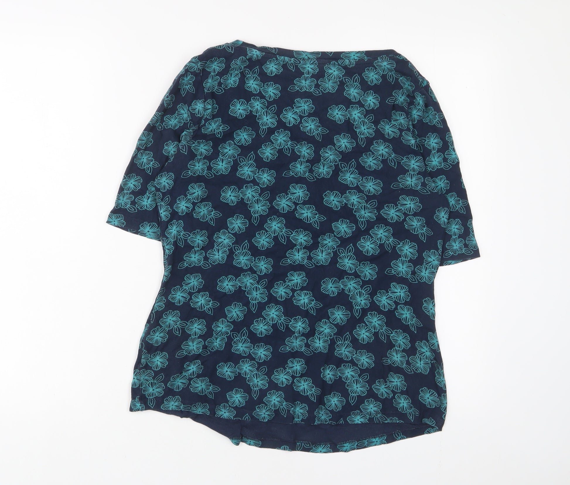 Womens Blue Floral Cotton Basic T-Shirt Size 14 Crew Neck