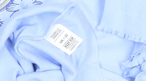 This lovely Marks and Spencer women's T-shirt in a calming shade of soft blue is a comfortable and flattering essential for everyday wear. Crafted from a smooth cotton and elastane jersey fabric, it ensures a breathable, lightweight feel with a touch of stretch for added comfort. The simple short-sleeved design features a classic crew neckline and a regular fit that flatters a size 22 figure with ease, offering a relaxed yet shapely silhouette perfect for casual wardrobes. The standout detail of this piece is the delicate embroidered and beaded floral motif on the front, adding a graceful and feminine touch that elevates this timeless top beyond the ordinary. Suitable for spring and summer, it pairs effortlessly with jeans, capris, skirts or casual trousers, making it ideal for an easy weekend outing, a relaxed lunch, or a day of errands. The quality of Marks and Spencer craftsmanship is evident throughout, offering a soft hand feel and reliable washability without compromising on style. This garment has been gently pre-loved and remains in excellent condition with only light signs of wear and no visible flaws, making it a wonderful choice for those who appreciate sustainable fashion and quality UK design. Whether layered under a cardigan in cooler months or worn on its own to enjoy warmer days, this versatile floral T-shirt delivers dependable comfort and understated elegance. A chic wardrobe staple with subtle detail, ready to bring freshness to your everyday collection. Perfect for anyone seeking durability, comfort, and a touch of charm in their casual wear, this Marks and Spencer floral tee will quickly become a go-to favourite.
