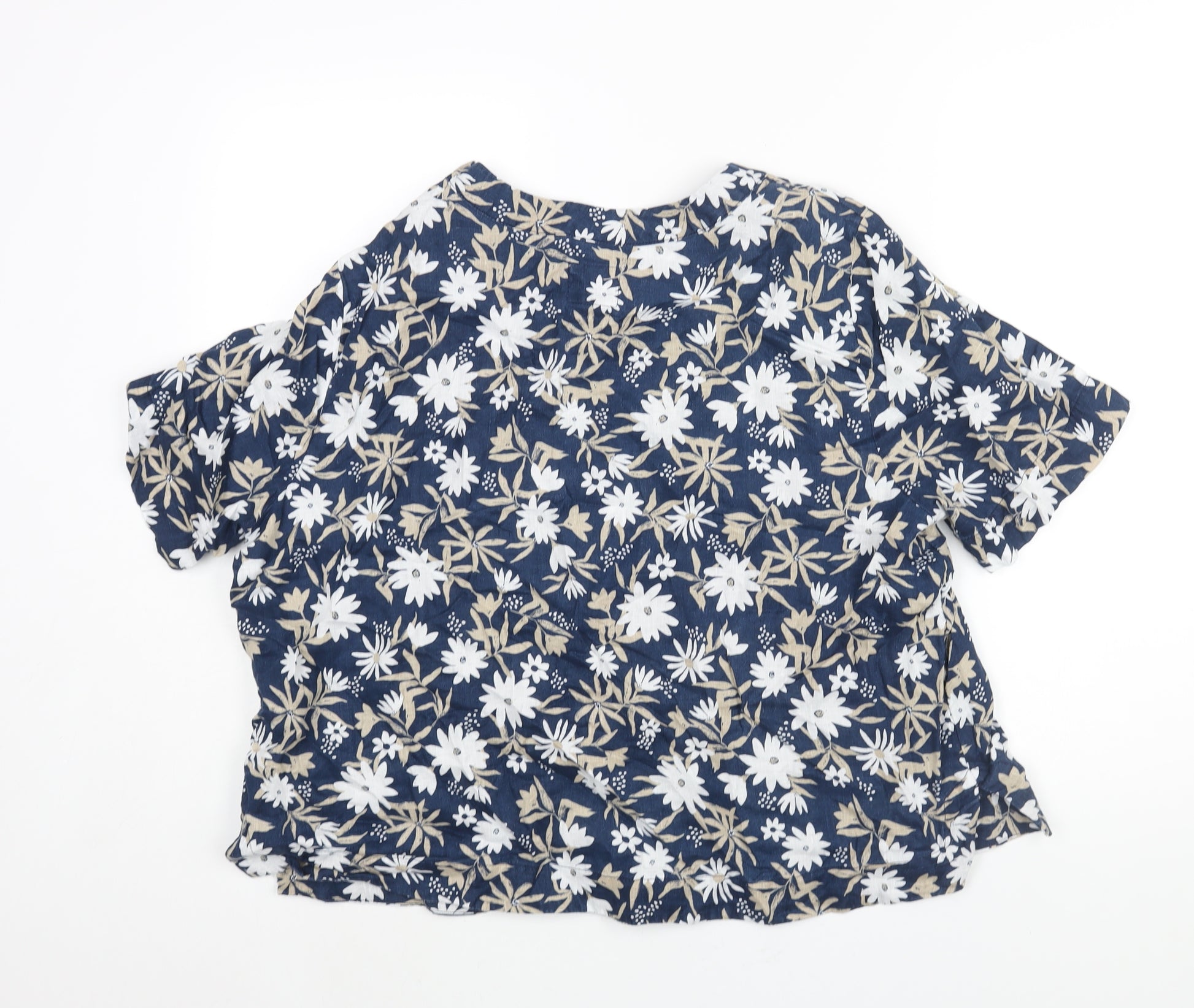 Womens Blue Floral Linen Basic Blouse Size 18 Round Neck