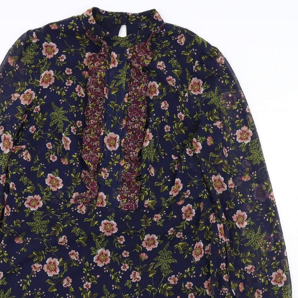 Womens Blue Floral Polyester A-Line Size 16 Mock Neck Zip