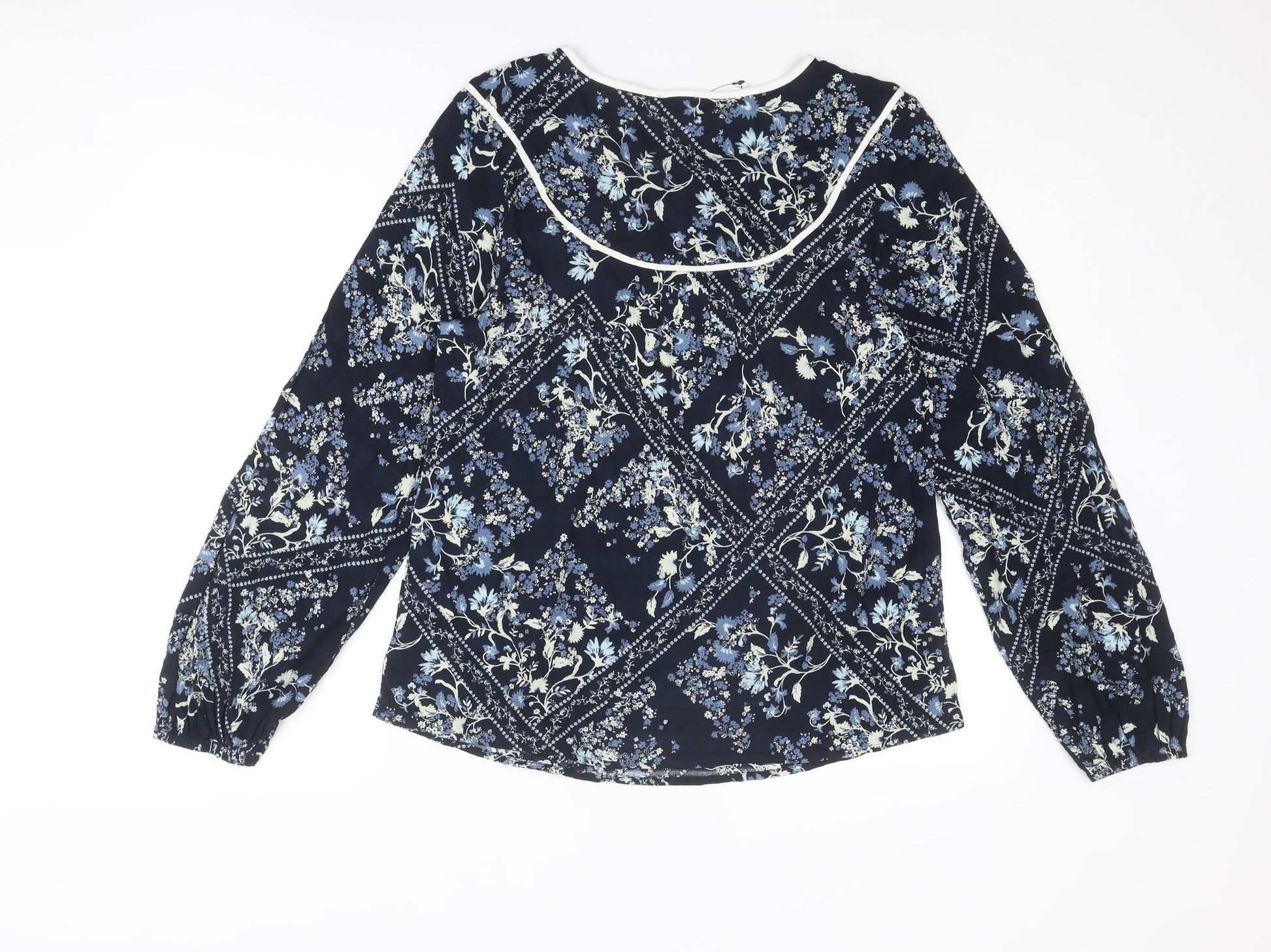 Womens Blue Floral Viscose Basic Blouse Size 10 Round Neck