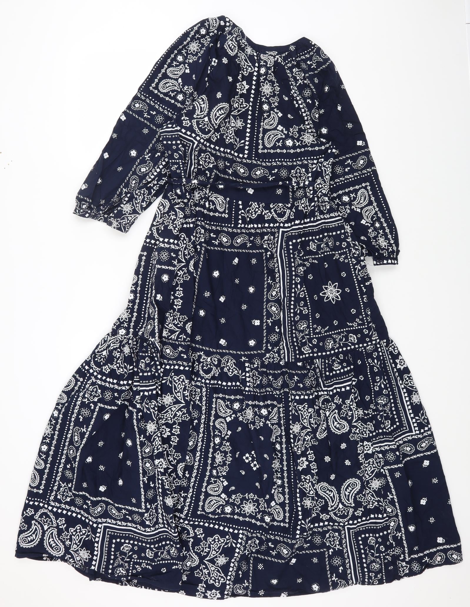 Womens Blue Geometric Cotton Maxi Size 10 Round Neck Button