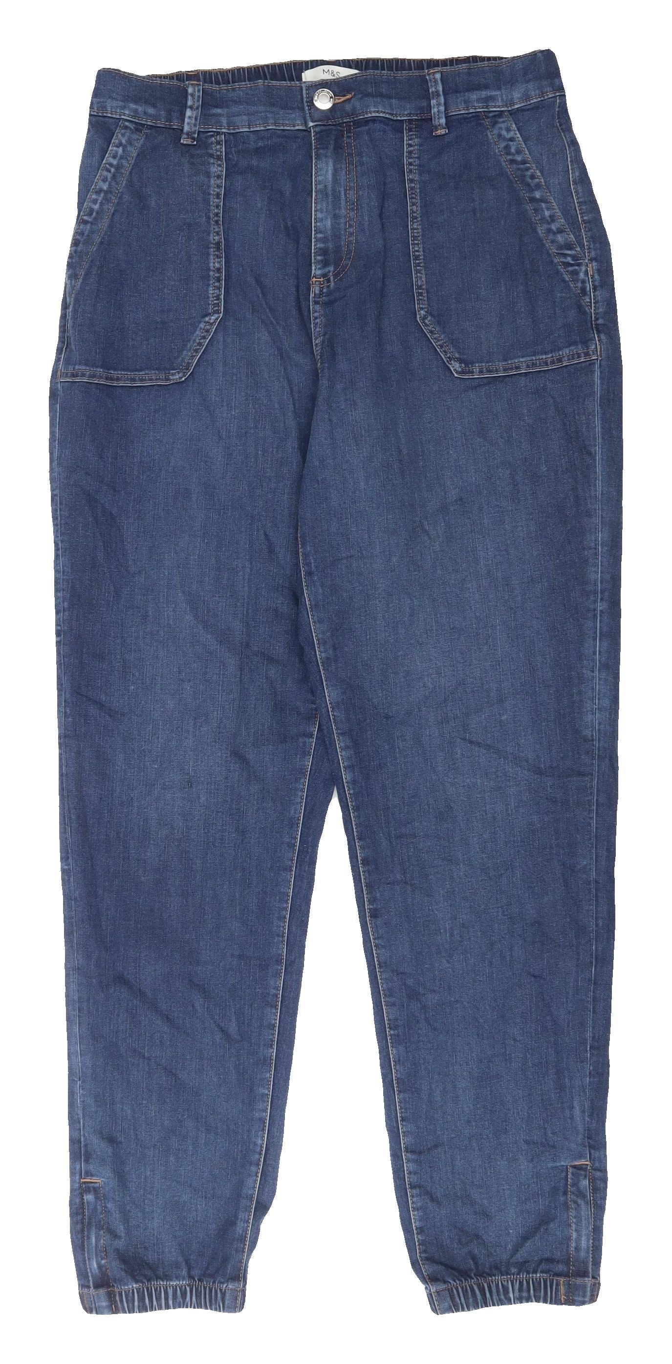 These stylish women's jogger jeans from Marks and Spencer offer the perfect blend of comfort and chic design. Made with a blend of cotton, polyester, viscose, and elastane, they are not only durable but also provide a flexible fit that moves with you throughout the day. Ideal for casual outings, these blue denim joggers feature a relaxed fit complemented by an elastic waist and convenient slash pockets. Perfect for the autumn season, pair them with your favourite tops for a fashionable, everyday look. These jeans have been well-maintained, showing no visible wear and appearing almost new.