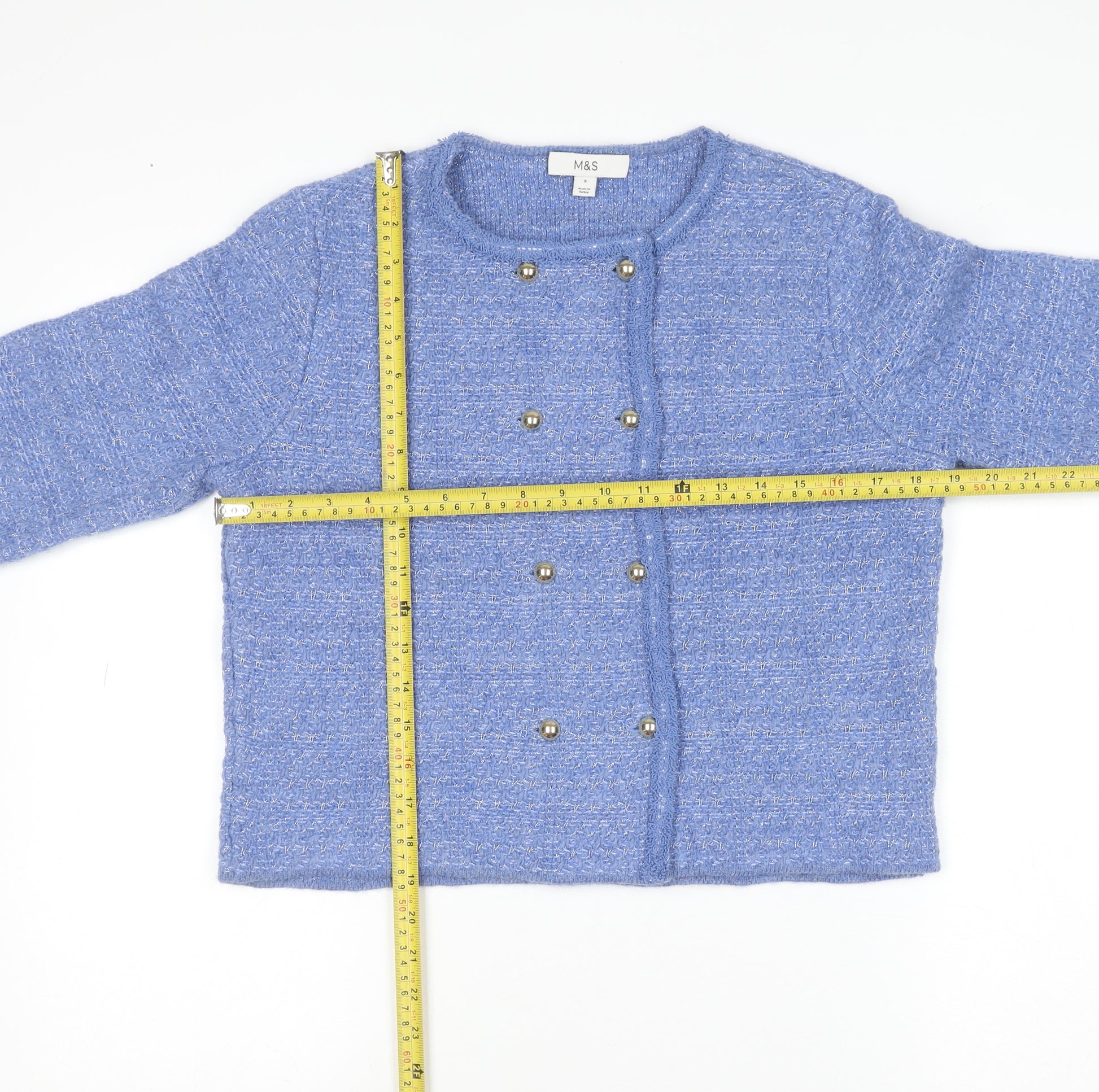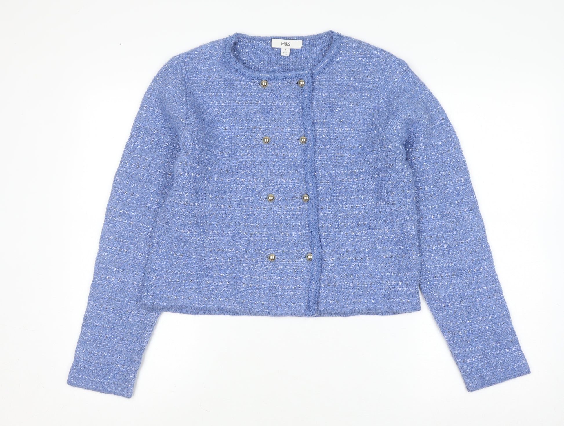 Add a touch of timeless elegance to your wardrobe with this women’s blue cardigan from Marks and Spencer. Tailored in a flattering regular fit, this classic knit style is perfect for layering across seasons. The soft crew neck design and sophisticated silver-tone button detailing add a refined touch, making it ideal for pairing with jeans for casual outings or over a blouse for a polished office look. Crafted from a quality material blend of acrylic, cotton, polyester, polyamide, and metallic fibres, it offers both comfort and durability while maintaining a lightweight feel. The fine tight-knit texture ensures a smooth drape and retains shape wear after wear. Designed for practicality, this cardigan is easy to care for and machine washable, allowing you to enjoy its charm without extra hassle. The long sleeves provide added warmth, making it suitable for autumn, winter, and the cooler days of spring. With its versatile blue colour, it complements a range of outfits and styles, whether you prefer a laid-back weekend ensemble or a chic business-casual look. The delicate touch of metallic thread subtly enhances its visual appeal, offering just the right amount of shimmer for a modern twist on a wardrobe essential. Ideal for the woman who values both comfort and sophistication, this Marks and Spencer cardigan provides everyday luxury at its best. Gently used and in excellent condition, it presents as nearly new with minimal signs of wear. A perfect choice for those seeking quality knitwear that balances traditional style and effortless elegance. Refresh your knitwear collection today with this must-have piece – stylish, practical, and quintessentially classic.