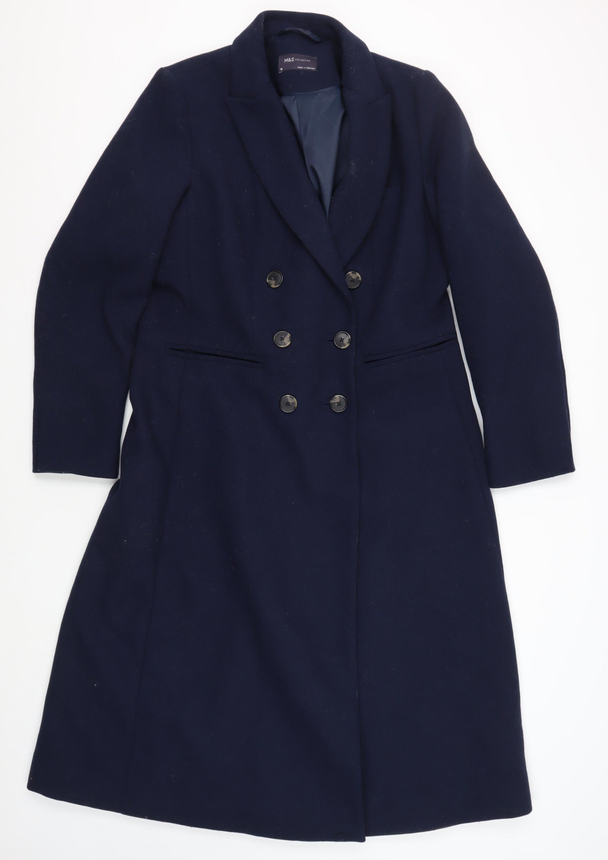 Elevate your autumn and winter wardrobe with this classic blue overcoat from Marks and Spencer. Crafted from a sophisticated blend of polyester and wool, this double-breasted coat offers both warmth and style. Designed for women, the coat features a sleek, long silhouette that lends an air of elegance to any outfit. Perfect for business and formal occasions, the button accents enhance its timeless appeal. With a polyester lining for added comfort, this coat is a versatile addition to your outerwear collection. Embrace the cool weather in style with this chic and enduring piece, ideal for a sophisticated look.
