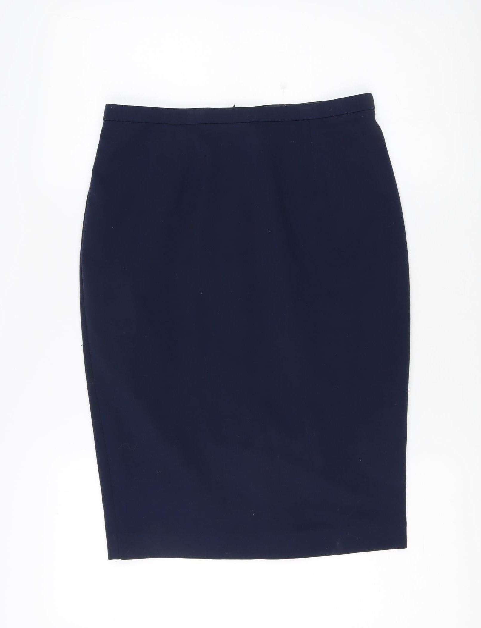 Elevate your wardrobe with this elegant Marks and Spencer Women's Blue Pencil Skirt, perfect for both business and workwear settings. Crafted from a quality blend of materials, including 63% polyester, 33% viscose, and 4% elastane, this skirt offers a sophisticated and sleek silhouette. The classic navy blue hue adds versatility, making it easy to pair with various tops and accessories. Designed in a straight and pencil style, it offers a timeless look that is sure to become a staple in your collection. With a convenient zip closure, this skirt is not only stylish but also practical for everyday wear. Its regular size type ensures a comfortable fit, while its pattern-free design adds a touch of minimal elegance to your outfit. Enjoy the ease of machine washability for effortless maintenance. Brand new, this skirt guarantees superb condition and a refined appearance that complements any professional setting. Enhance your ensemble with this must-have piece that's ready to make a statement in your closet.